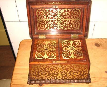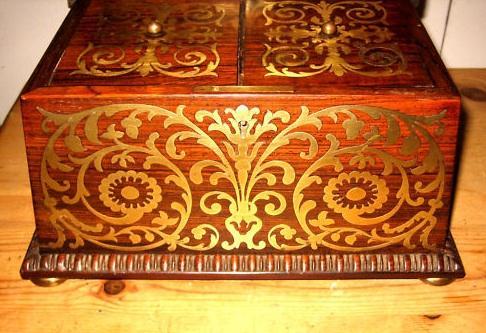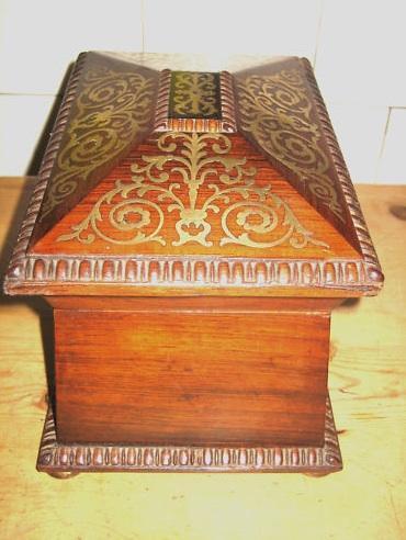 STUNNING 19THC ROSEWOOD BRASS INLAID TEA CADDIE C1840, A FINE QUALITY 19THC ROSEWOOD AND BRASS INLAID TEA CADDY C1840 , THE CADDY MEASURES 9 in LONG 6in WIDE EXCELLENT ORIGINAL CONDITION PROFUSELY INLAID WITH BRASS EVEN INSIDE OF THE LID AND CADDIE COVERS, WITH ORIGINAL BRASS SQUASHED BUN FEET, GREAT COLOUR AND PATINATION, A RARE CHANCE INDEED