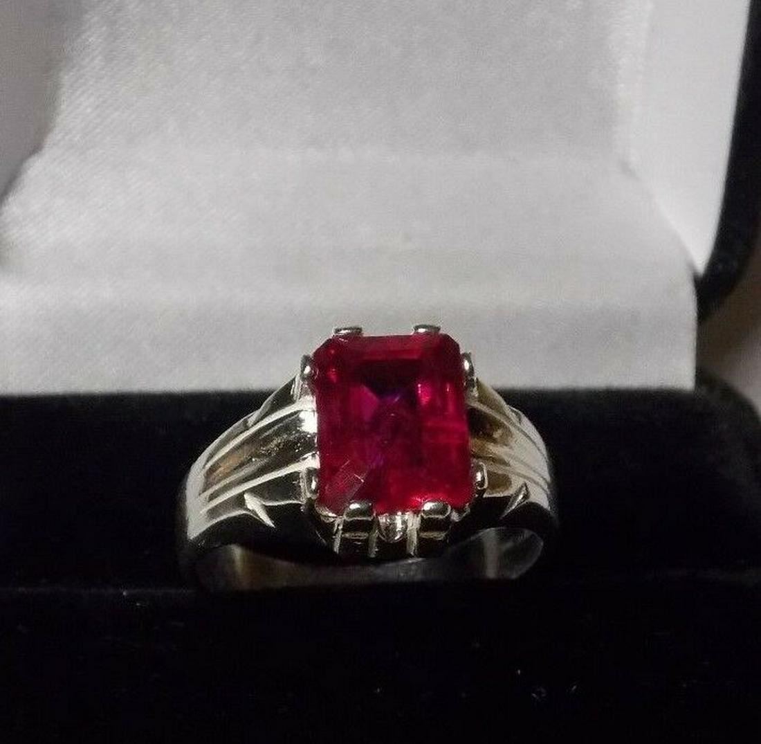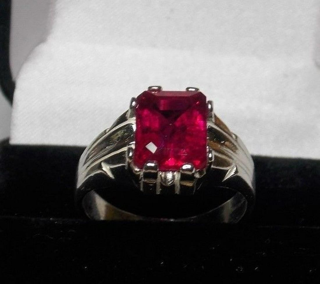 STUNNING 5 CT VVS1 RUBY RING. THIS LAB CREATED RUBY RING IS NEAR FLAWLESS. BEAUTIFUL EMERALD CUT MOUNTED IN ELABORATELY DESIGNED SOLID .925 STERLING SILVER SIZE 8. THE TOTAL GRAM WT IS 5.3 GRAMS. THIS RING IS BEAUTIFUL AND HAS THE SAME CHEMICAL COMPOUNDS AS A MINED FROM THE EARTH RUBY.This ruby has the same chemical compound as natural, mined from the earth,ruby.Type Corundom. GIA Description. Some gemstones have synthetic counterparts that have essentially the same chemical, physical, and optical properties, but are grown by man in a laboratory. This lab ruby has the exact chemical composition : Al2O3Crystal Structure: Hexagonal Purity: 99.99% Refractive Index: 1.717 Density: 3.98-4.1 g/cm3 Hardness Mohs: 9. What a find for any gem enthusiast. The closest thing to real. Same exact chemical componds in this beauty with out the enormous tag price a near flawless 16 ct 16 mm. Burma ruby would bring.