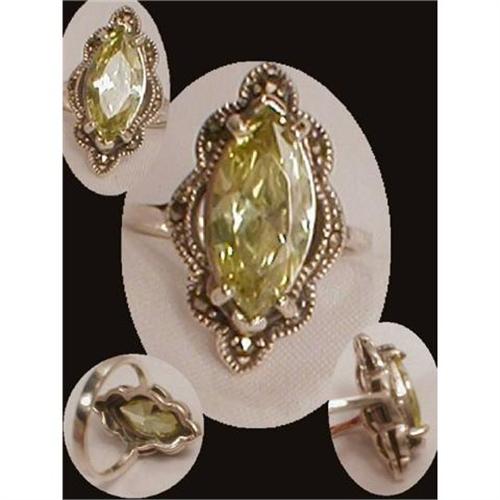 What an elegant ring this 7ct citrine is set in! The setting is 1" long and there are mint condition marcasites that surround it so it really flashes!The sides of the setting are open as in a lot of deco pieces. THis is sterling and is a size 7. I don't think it has ever been worn.