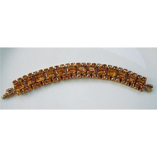 For sale is a STUNNING Vintage Amber Color Rhinestone Bracelet. There are 13 rhinestones that run up the center of the bracelet and 25 smaller rhinestones on each side of the bracelet, making a total of 63 rhinestones. The bracelet is in excellent condition with no missing, dead or discolored stones. The front and back are in excellent condition. There is no wear to the goldtone. All the stones are prong set in goldtone. It has a fold-over clasp that locks securely. The designer Is unknown. How nice it would be to be the proud owner of this beauty!