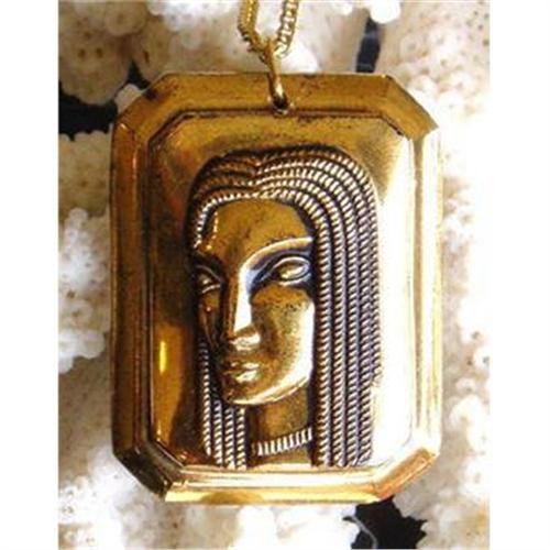 This is truly magnificent Art Deco piece!!! The pendant depicting head of a young woman with braided hair is black glass with bright metallic gold application. The image is 3D - molded in relief. Dimension : 1-1/2" x 1-1/8", 18" long chain. Excellent condition, circa 1930's.