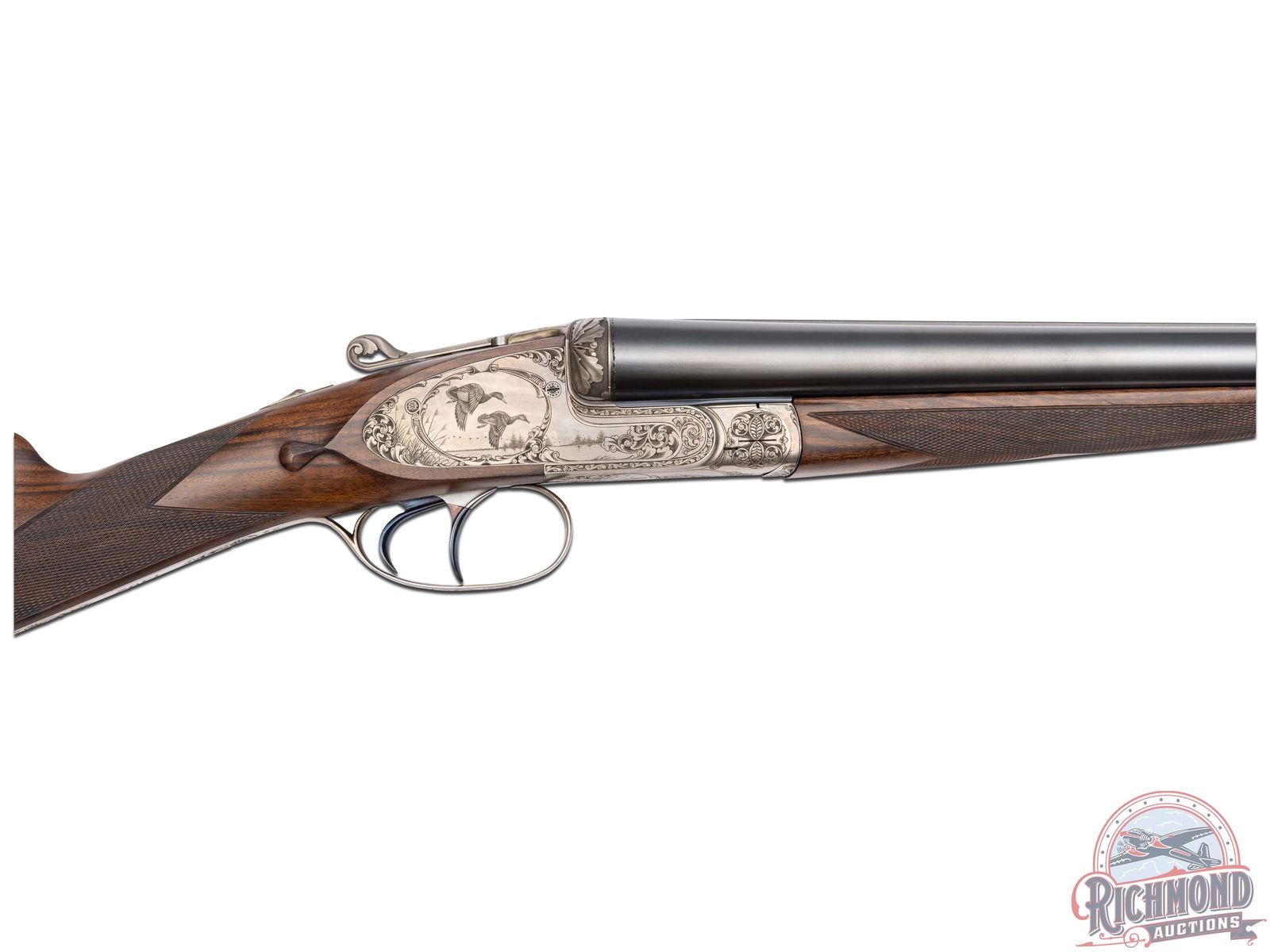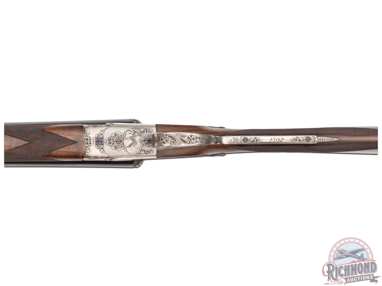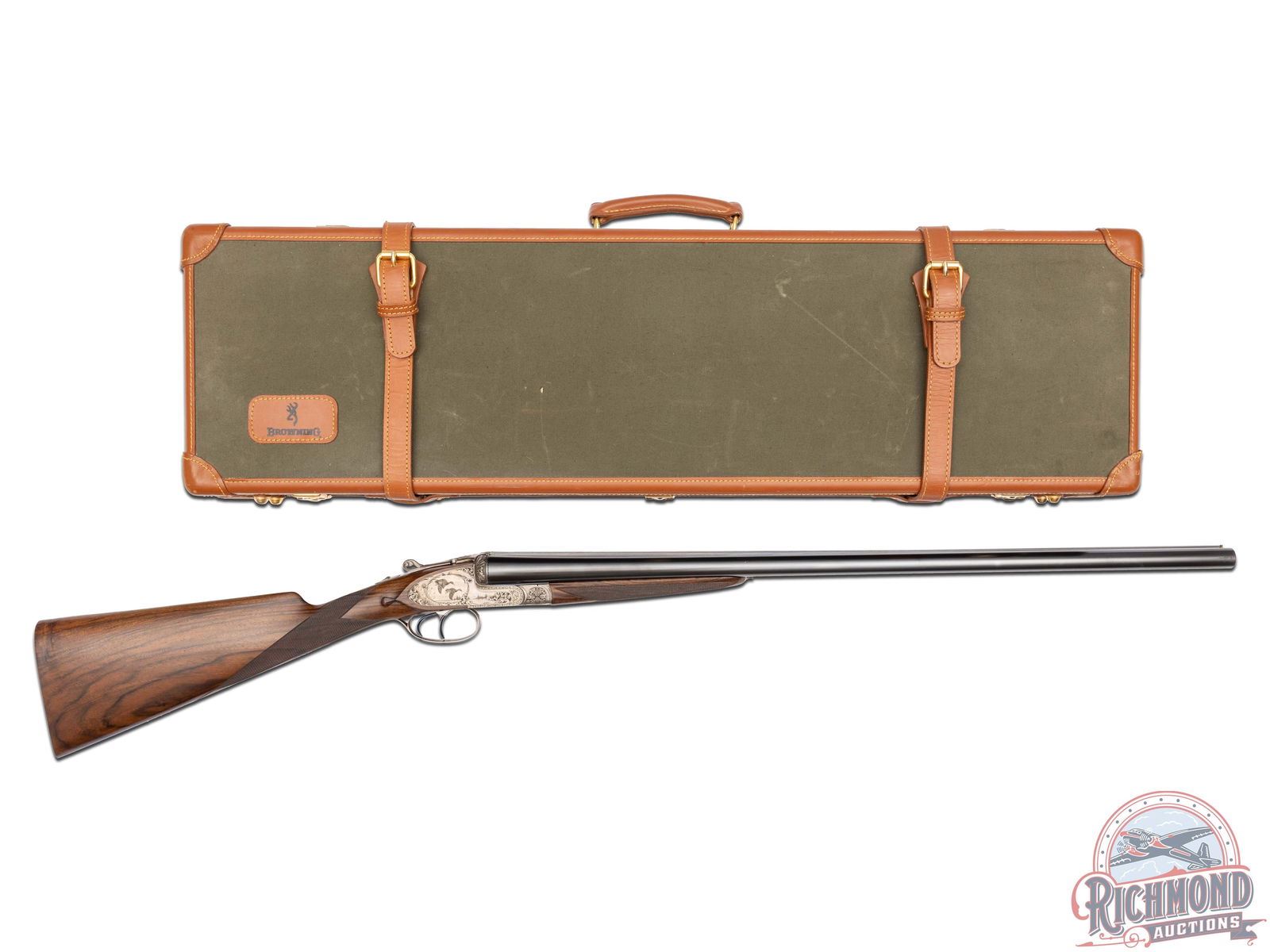Gorgeous Browning custom side by side shotgun made in Belgium. Features 28-1/2" blued solid vent barrels with brass bead front sight, chambered for 2-3/4" shells choked Modified and Improved Cylinder. Coin finished action with stunning deep relief engraved coverage. Left panel features pheasants in a field scene surround by a floral scroll design. Right side features two ducks in flight over a pond surrounded by a floral scroll design. Fences features deep relief oak leaves with a punch dot background. Scroll engraved release lever with ornate thumb press. Bottom features a woodcock in flight surrounded by a floral scroll design that resonates down the tang and trigger guard. Signed "B.Barra" by master engraver Brunno Barra next to the front trigger. Double triggers finished in blue with a tang mounted safety. case-hardened water table with Nitro Proof marks. Nicely figured walnut straight grip stock with skip-line checkered butt plate and checkered grip. Matching walnut checkered forearm with Anson release and matching engraving on the hardware. Comes in a nice Browning canvas and leather luggage case. LOP: 14-3/4". DAC: 1". DAH: 1-3/8". CALIBER: 12 GA. S/N: 1502. FFL STATUS: Modern.