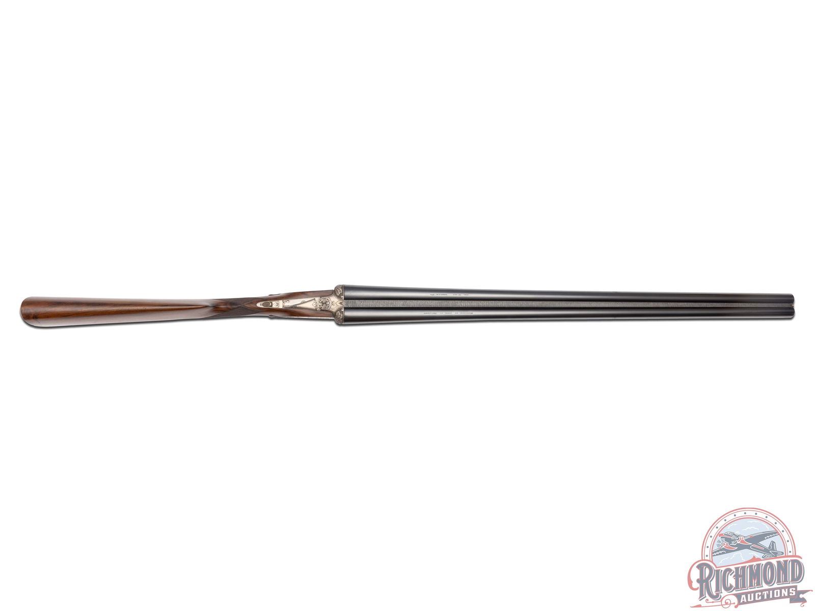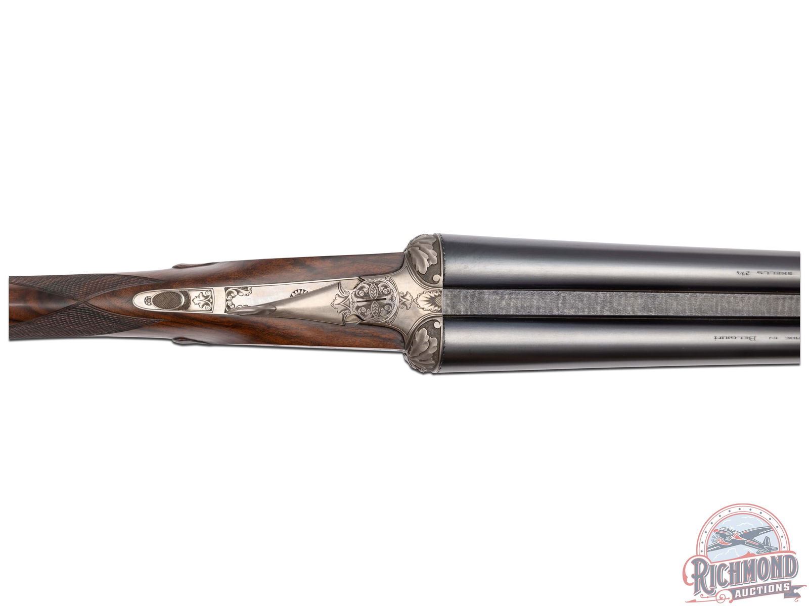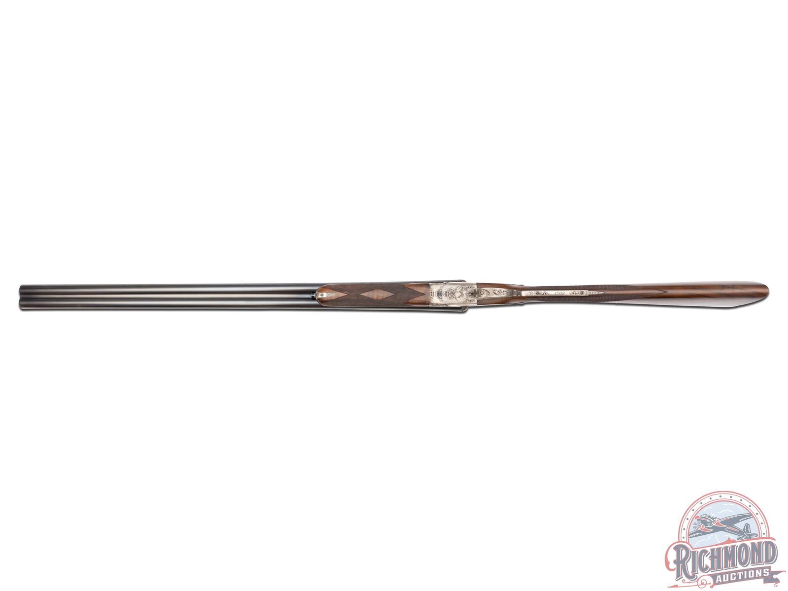 Gorgeous Browning custom side by side shotgun made in Belgium. Features 28-1/2" blued solid vent barrels with brass bead front sight, chambered for 2-3/4" shells choked Modified and Improved Cylinder. Coin finished action with stunning deep relief engraved coverage. Left panel features pheasants in a field scene surround by a floral scroll design. Right side features two ducks in flight over a pond surrounded by a floral scroll design. Fences features deep relief oak leaves with a punch dot background. Scroll engraved release lever with ornate thumb press. Bottom features a woodcock in flight surrounded by a floral scroll design that resonates down the tang and trigger guard. Signed "B.Barra" by master engraver Brunno Barra next to the front trigger. Double triggers finished in blue with a tang mounted safety. case-hardened water table with Nitro Proof marks. Nicely figured walnut straight grip stock with skip-line checkered butt plate and checkered grip. Matching walnut checkered forearm with Anson release and matching engraving on the hardware. Comes in a nice Browning canvas and leather luggage case. LOP: 14-3/4". DAC: 1". DAH: 1-3/8". CALIBER: 12 GA. S/N: 1502. FFL STATUS: Modern.