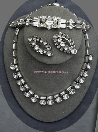 STUNNING COLLECTION OF EISENBERG VINTAGE FASHION JEWELRY THAT HAS BEEN SAFE IN A DEPOSIT BOX FOR YEARS AND STILL IS IN MINT CONDITION. THIS SET FEATURES A MATCHING SET OF LARGE CRYSTAL AND RHINESTONE VINTAGE PIECES INCLUDING NECKLACE, CLIP BACK STYLE EARRINGS, AND BRACELET.