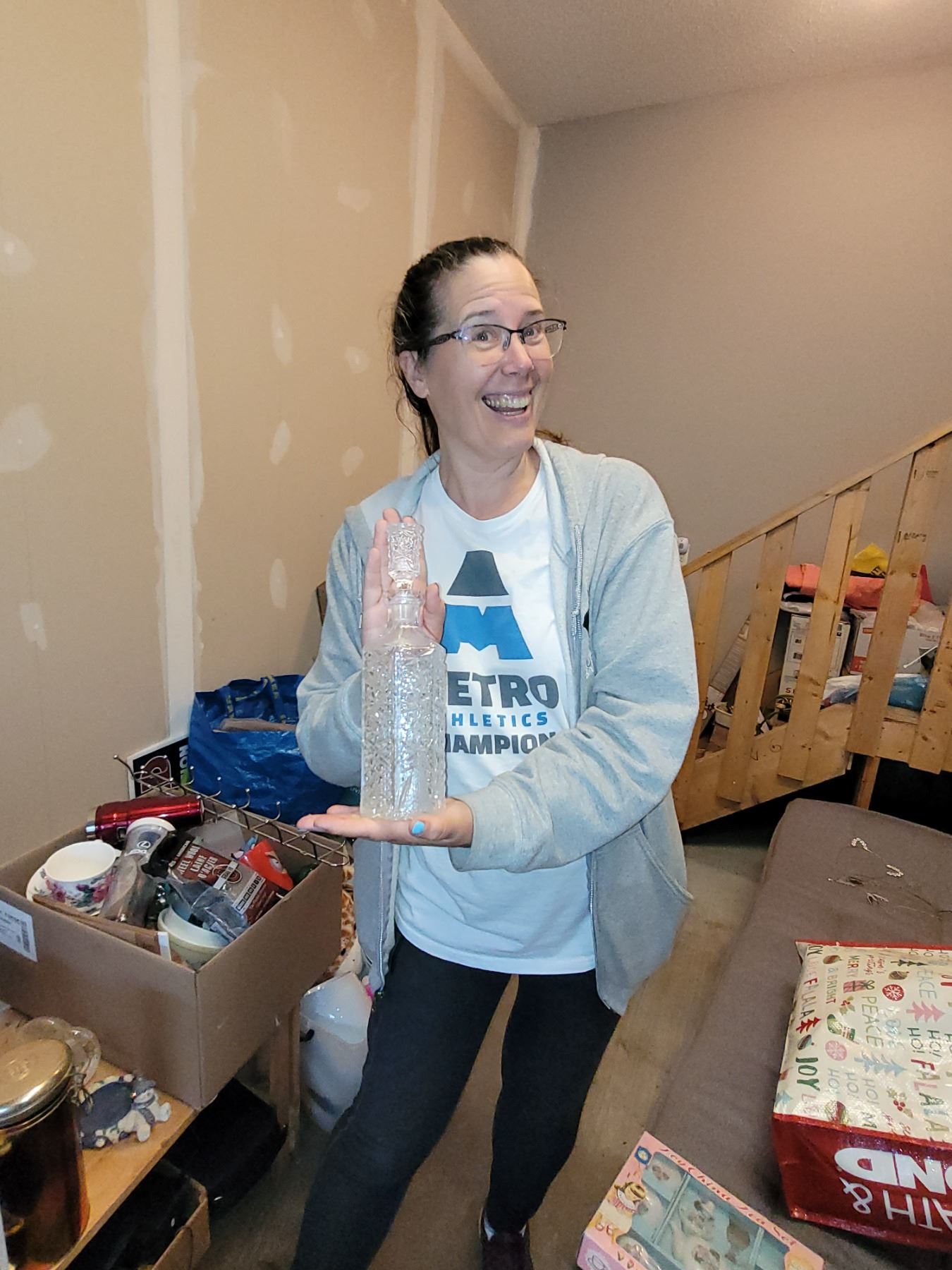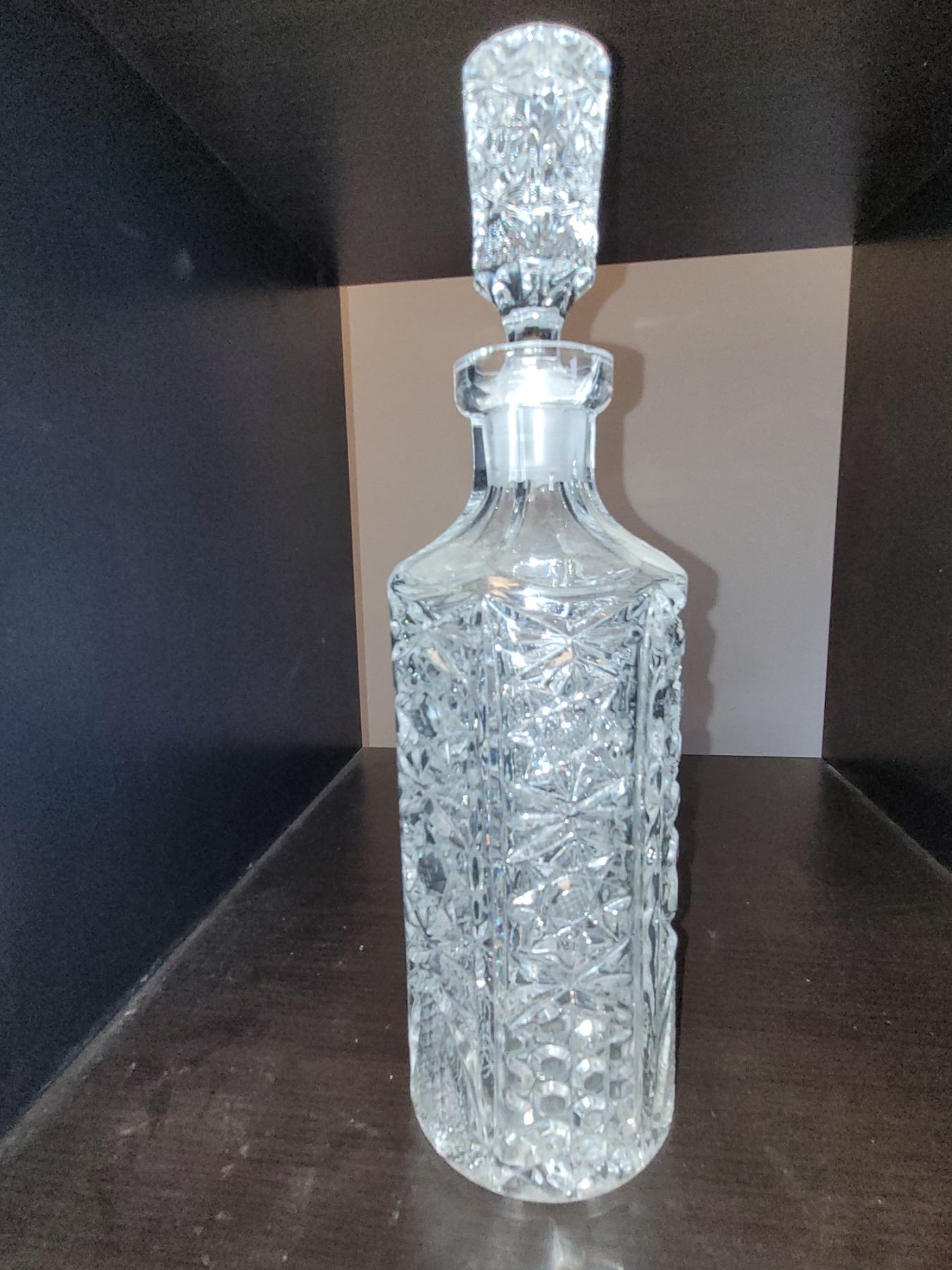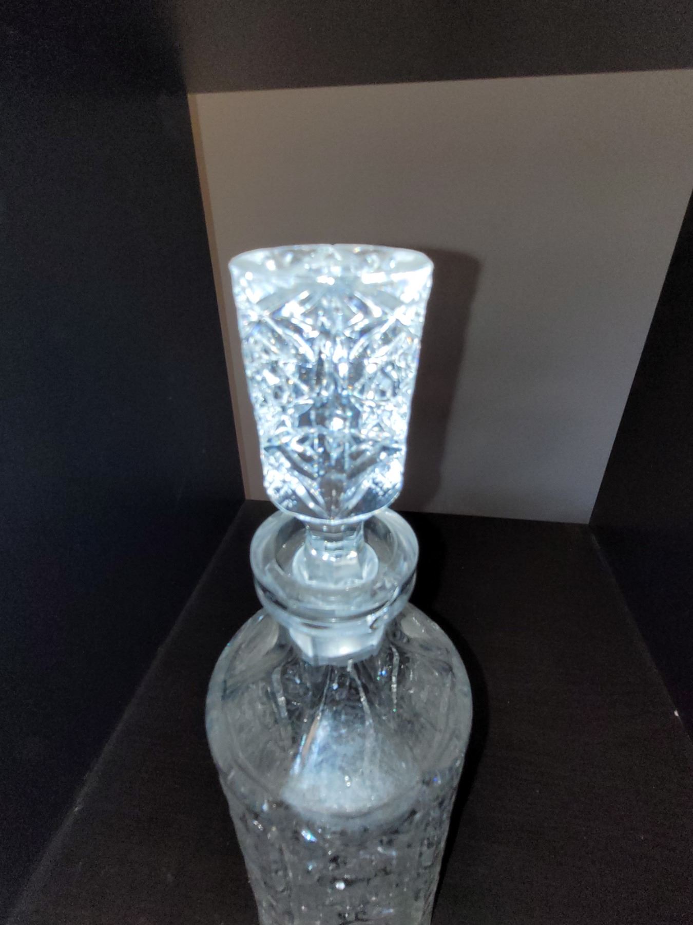 STUNNIUGN CRYSTAL DECANTER WITH LID. MEASURES 11" TALL. AS IS WHERE IS. NO REFUND. NO RETURNS