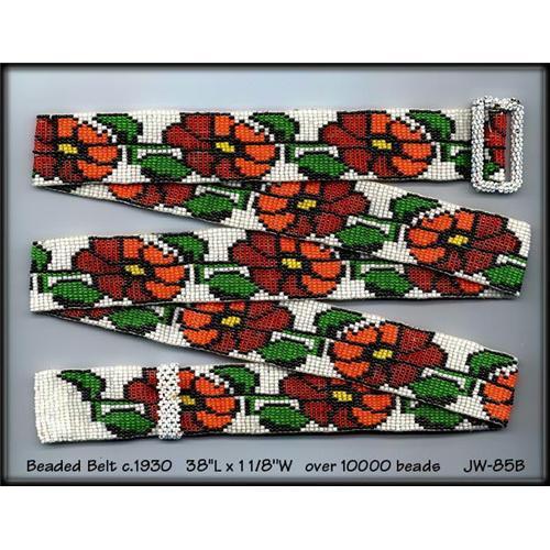 </font></strong>Stunning Vintage Art Deco hand beaded belt composed of approximately 10 000 glass beads in outstanding floral geometrical design. Color of beads : Opaque orange, white, green, black, yellow and transparent topaz color. MINT condition, circa 1920-30's. The belt is 38 inches long and 1 1/8 inches wide. All of you "beaders" know how long it would take to complete this fine work of Art....</font>