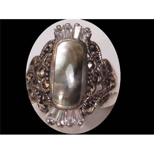 This large setting ( 1 1/4") sterling setting has two queens crowns on either end set in baguettes.The center stones is so beautiful that it shimmers and changes with the light. The ring is a size 9 and is MUCH prettier than the photos. It has good weight to it to.