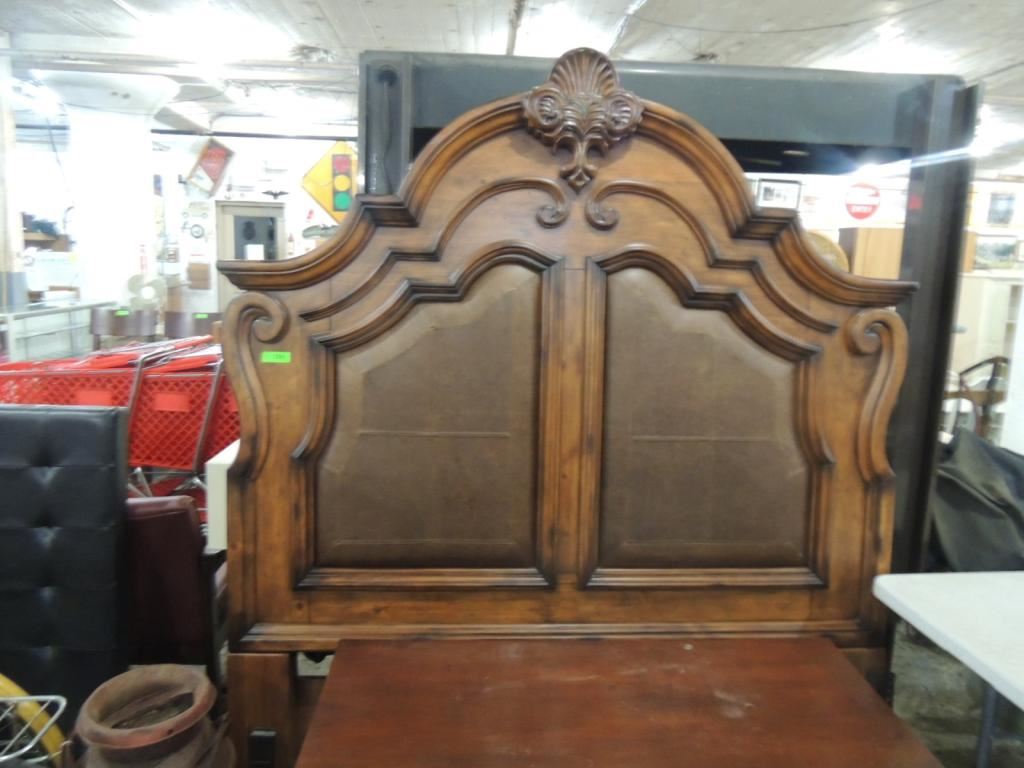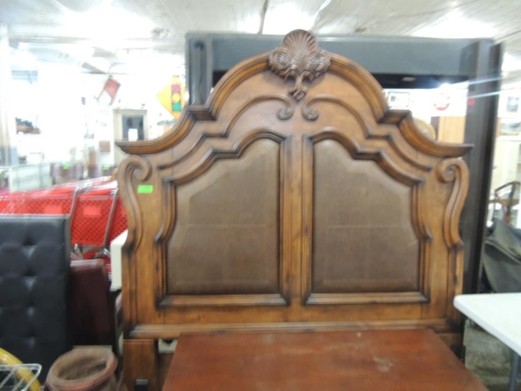 LEATHER UPHOLSTERED SECTION, BEAUTIFUL WOODEN TALL HEADBOARD, STUNNING HEADBOARD, AS SHOWN SEE PHOTO FOR MORE DETAILS.