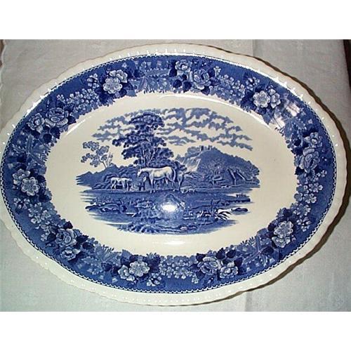THIS LOVELY PLATTER SAT IN MY MOM'S CHINA CABINET FOR A LONG TIME; ITS PROBABLY 40 YEARS OLD OR SO AND I DON'T THINK EVER USED AS THERE ARE NO CHIPS, SCRATCHES OR CRAZING. SHE HAD A LOVE OF BLUE WILLOW AND HORSES AND WAS THRILLED WHEN SOMEONE GAVE HER THIS 14" LONG x 10.5" WIDE PLATTER! ITS MARKED ON THE BACK: REAL ENGLISH IRONSTONE. ADAMS, MEMBER OF THE WEDGWOOD GROUP. ENGLISH SCENIC. DECORATION COMPLETELY UNDERGLAZE. ACID AND DETERGENT PROOF. COLORS ARE BRIGHT AND CLEAR; NICE DETAILED EDGING. WE ARE WELL EXPERIENCED IN PACKING/SHIPPING WORLDWIDE WHICH IS NOT EXPENSIVE FROM MONTREAL, CANADA.