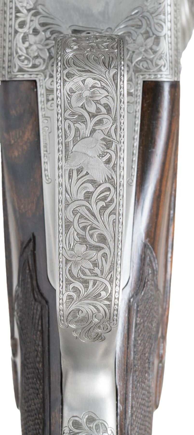 PARKER REPRODUCTION LIMITED EDITION A1 SPECIAL TWO BARREL SET SXS SHOTGUN. Cal. 20 GA". S# 20-155. Bbl. #1: 28" with 2 3/4" and 3" chambers. Bbl. #2: 26" 2 3/4" chambers. Both bbls. are marked "Overload Proved". "O" frame boxlock action featuring selective ejectors and gold finished checkered single selective trigger. A1 Special quality engraving by Master Engraver Geoffroy Gournet of Easton, PA, 1960-2025. Full coverage foliate scroll hand engraving has elaborate borders and shaded backgrounds. Center piece of the engraving is the floorplate vignette featuring a bulino style engraved setters head based on artwork in the book "Dogs in the Field" by Marguerite Kirmse. Bottom of frame has raised gold "Parker Bros" marking. The frame features finely sculpted bolsters with 3-flutes. The sculpted top lever has a 5-fluted center section. The floral engraving extends to the long tang trigger guard, skeleton steel buttplate, forearm iron, Deeley release, and sculpted tip. Breech section of both bbls. have wedges of matching floral engraving ahead of single gold line wedding bands at breech ends. Trigger guard bow features a rising woodcock. Safe marking on top tang and S# marking on trigger guard tang are both gold inlaid. Action and fittings have a fine custom French gray finish. Splinter forearm and straight hand stock of fine thin shell walnut with vivid dark streaking and striking light to medium brown tones. A1 Special Grade 24 LPI hand checkering featuring carved borders with extra panels of checkering on the stock ears and sculpted fluer-di-lis highlights. Skeleton butt has complimentary single border fluer-di-lis hand checkering. Toe line of stock has an unmarked oval presentation plate. LOP: 14 1/8" over the skeleton buttplate. DAC: 1 1/4". DAH: 2 1/16". Stock has a near neutral cast. Downward pitch is 2 3/8" with 28" bbls. Bbl. #1, 28":Bore Diameter: RT: .619, LT: .619. Choke Constriction: RT: .005 (Improved Cyl.), LT: .011 (Light Mod.). Minimum Wall Thickness: RT: .033, LT: .034. Bbl. #2, 26":Bore Diameter: RT: .619, LT: .616. Choke Constriction: RT: .010 (Light Mod.), LT: .012 (Light Mod.). Minimum Wall Thickness: RT: .037, LT: .035. Weight: with 28" bbls.: 6lbs. 11.6oz. Both sets of bbls. are fitted with ivory front and mid beads. Ribs are marked "Parker Reproduction by WINCHESTER East Alton IL. U.S.A. Made in Japan". The Parker Reproduction shotguns were mfg. to original Parker specifications by Winchester starting in 1983 until the factory was closed in January of 1989. During 2004 Connecticut Shotgun Manufacturing Company offered a limited quantity of A1 Specials in-the-white without metal finish or engraving in 12 or 20 gauge only. Without cases or accessories the price of a 2 bbl. set without engraving and metal finish was $6,750. This gun was purchased by the consignor and finished to his preferences by some of the finest craftsman in the business. French born Master Engraver Geoffroy Gournet who studied at the Liege, Belgium School of Gunsmithing and later worked under some of Italy's finest master engravers was commissioned to embellish this masterpiece. Mr. Gournet, while employed by Parker Reproductions, engraved all of the Parker A1 customs (approx. 300 over a 15 year period) which showcased Parker Reproductions highest level of ornamentation. The exquisite rust blue bbl. finish was done by Andrew McFarland. The stock was refinished at the time of the engraving by Stephan Hutton of Britinnia Arms, formerly of Churchill. UNATTACHED ACCESSORIES: gun is housed within an oak and leather case with brass corners and fittings. Purple velour 2-bbl. set fitted interior. Inside of case lid has black Parker Reproduction label. Case is protected by a leather trimmed khaki canvas zippered cover. Also included is a finely detailed account of the meticulous building of this very special shotgun. Parker Reproductions specifications/Features fold out pamphlet. CONDITION: near excellent as custom finished. Bbls. and action retain virtually all rust blue and French gray finish. Gold finished trigger shows small spots of discoloration. Refinished wood shows a few scattered superficial handling marks with spots of light wear. Both bbls. have bright near excellent bores. Case is in near excellent condition. This is possibly the finest Limited Edition Parker Reproduction A1 Special in existence. (25-3415/DS/MLW). MODERN. $14,000-19,000.