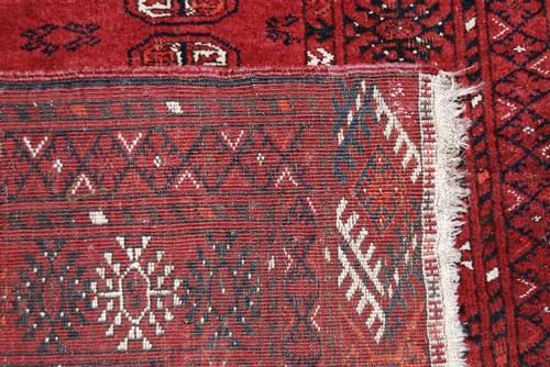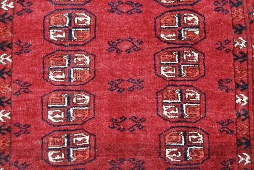 STUNNING GEOMETRIC MEDALLION DESIGN PERSIAN TURKMAN RUG. SIZE 3.10 X 6.6 FEET, MADE OF FINE QUALITY LAMB'S WOOL PILE ON COTTON FOUNDATION, ALL NATURAL VEGETABLE DYE, INCORPORATING A BEAUTIFUL ALLOVER MEDALLION DESIGN ON RICH RED BACKGROUND FRAMED BY AN INTRICATELY DONE MULTI LAYERED GEOMETRIC BORDER. HAND WOVEN IN IRAN.