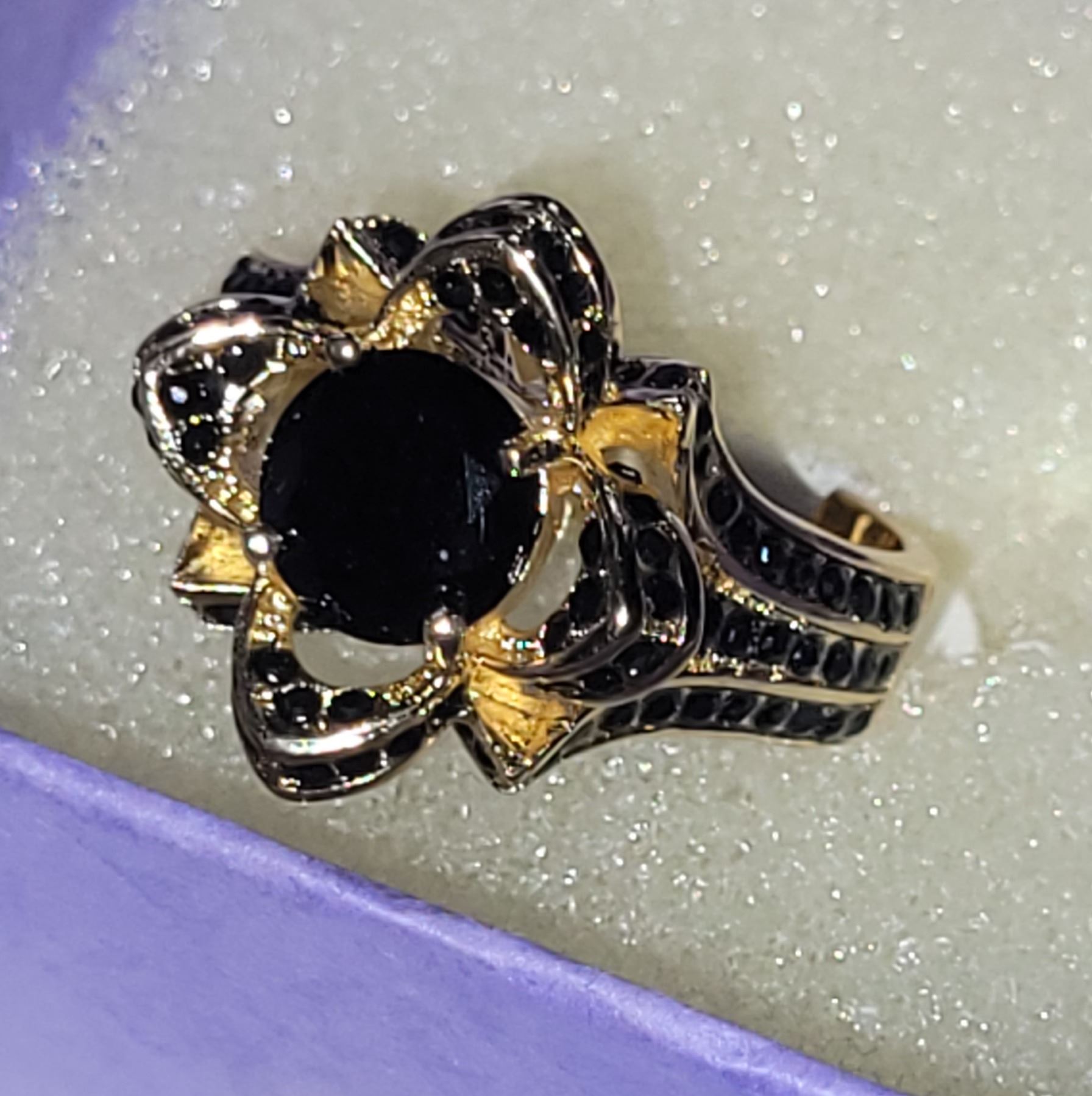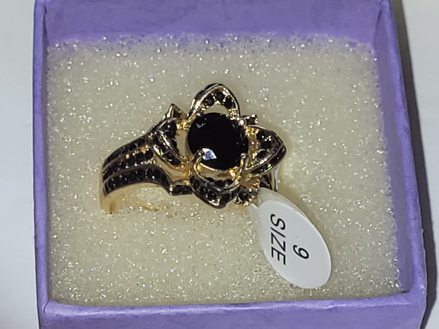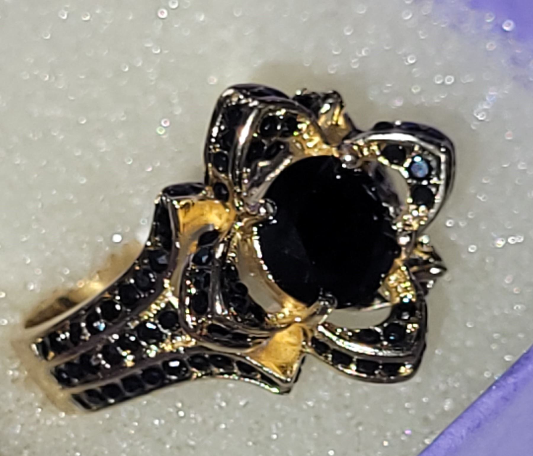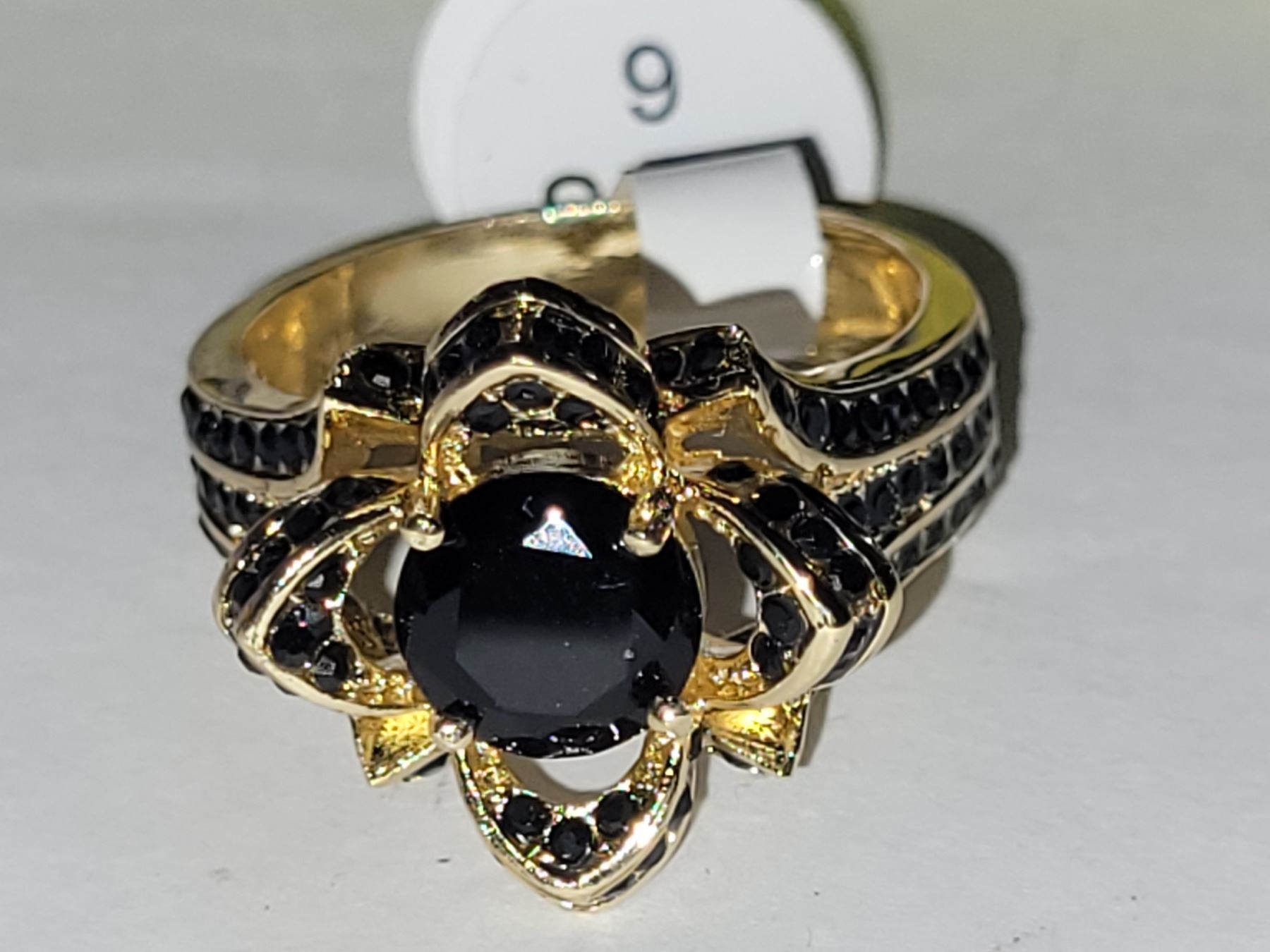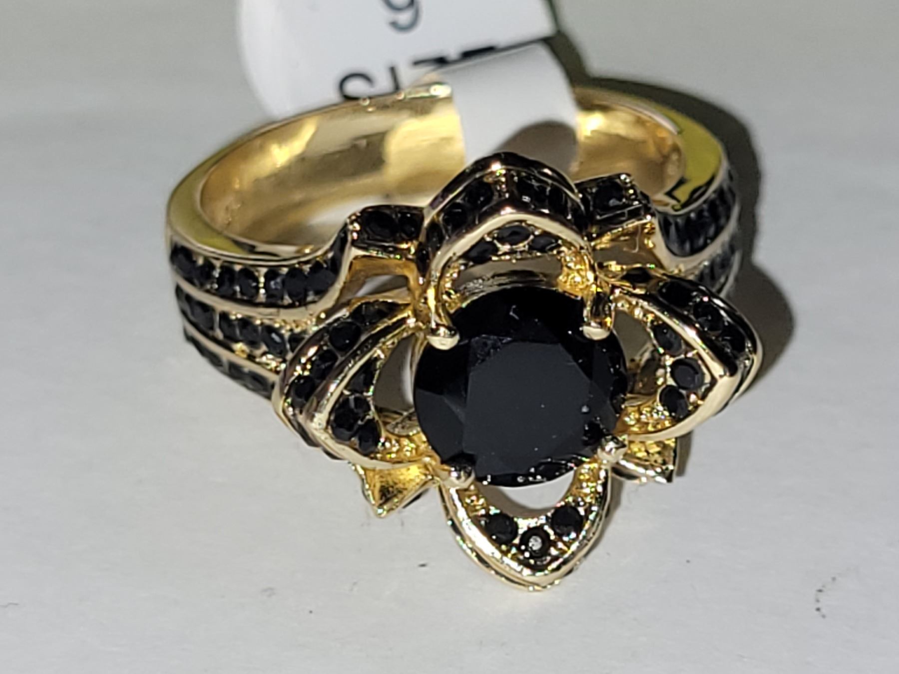 STUNNING GOLD TONE BLACK DIAMOND RING. STONES HAVE ARE UNTESTED. NO MARKINGS ON THE BAND OF THE RING. MAY BE SIMULATED STONES. SIZE 9. FROM ESTATE. SEE PICTURES AND JUDGE FOR YOURSELF!