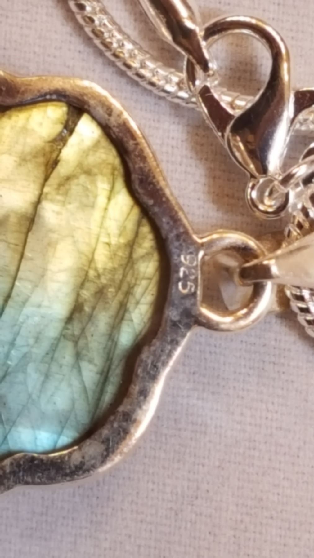 STUNNING RARE HAND CARVED LABRADORITE BUDDAH PENDANT.12.77 CT GEM WT. This Luminicent Labradorite Pendant Is Mounted In Solid .925 Sterling Silver. Includes 20 " Long Chain. 86 Cttw or 17.2 Grams. High. Labradorite is the stone of magical awakening. Experts say that it's vibrations cast a broad level of protection for negative energy. A stone of magic, serendipity and, synchronicity.