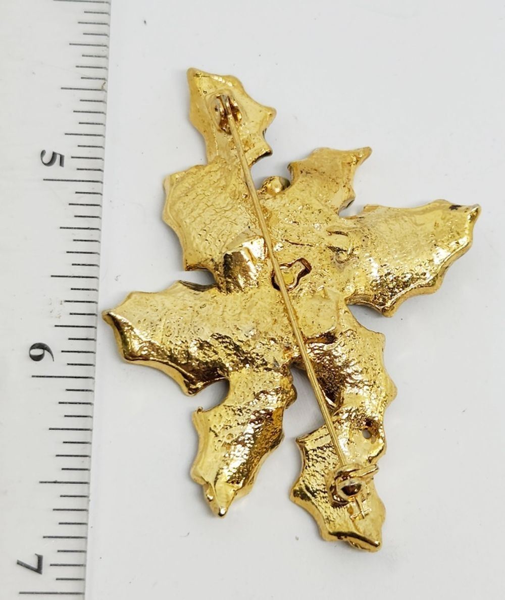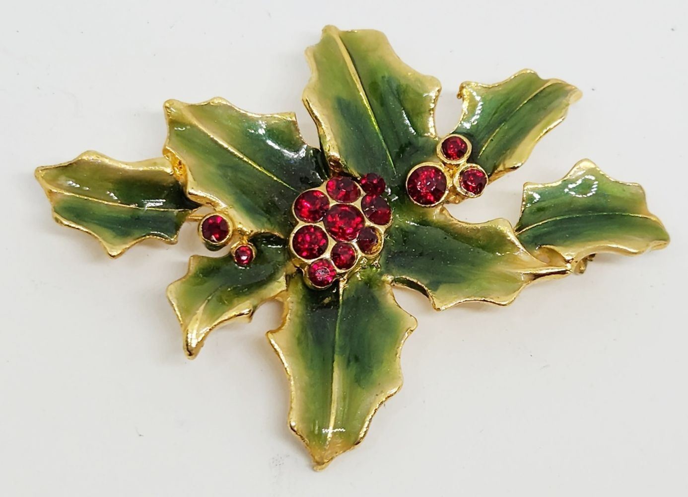 STUNNING HEAVY HOLLY BROOCH WITH RUBY RED STONE BERRIES , GREEN AND GOLD TONE LEAVES