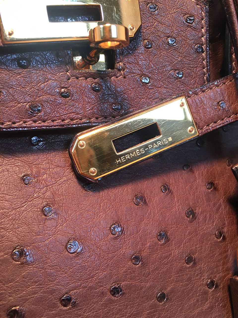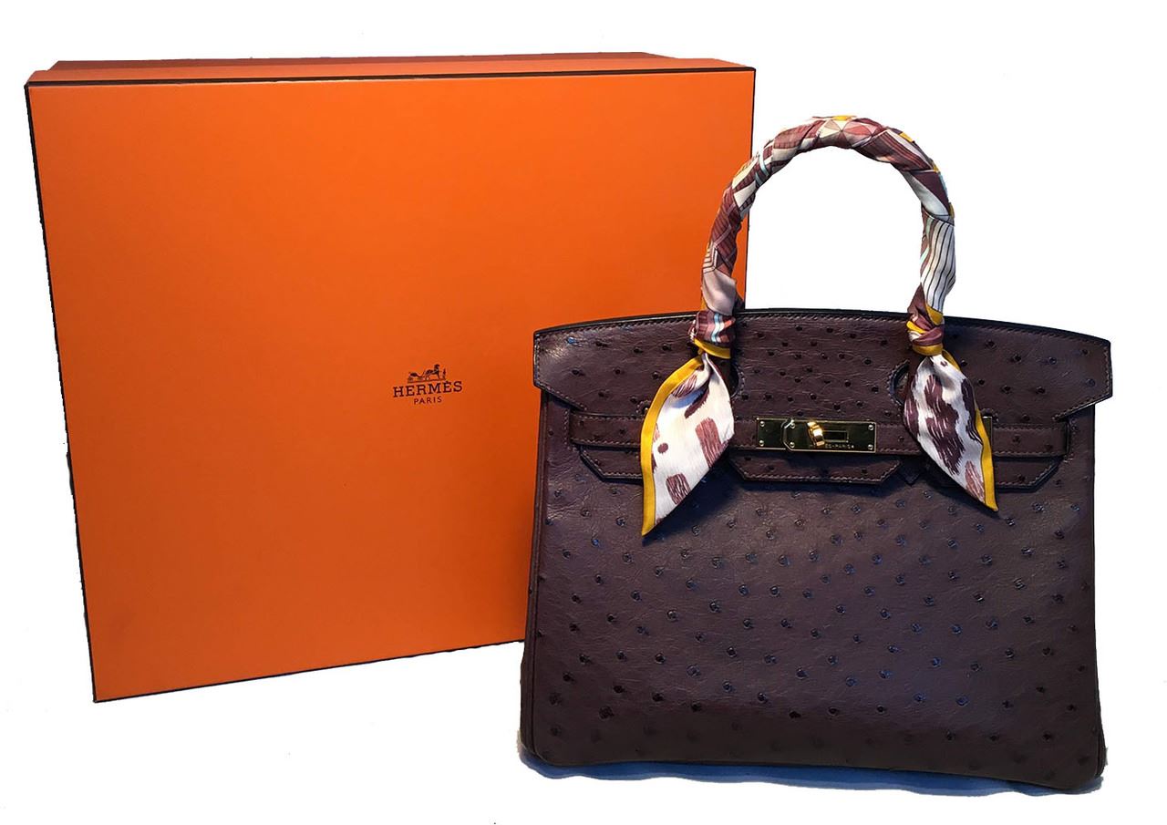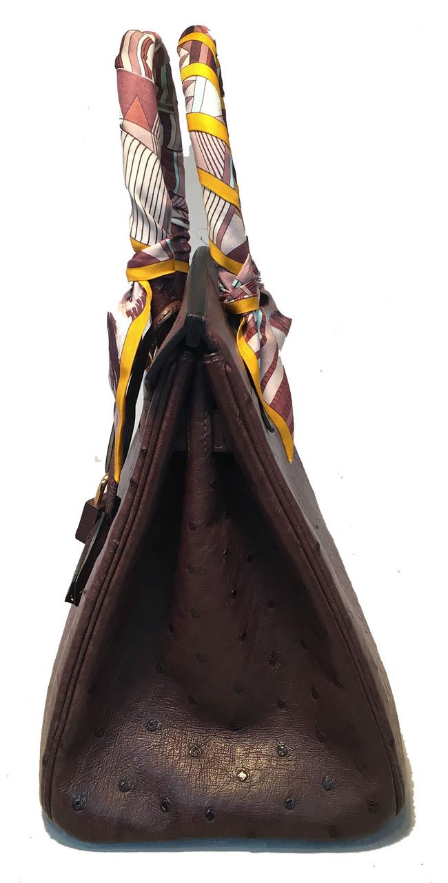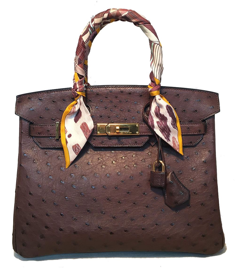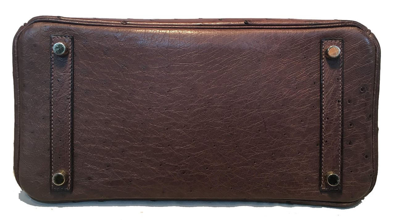 STUNNING Hermes Brown Ostrich 30cm Birkin Bag in excellent condition. Brown ostrich leather exterior trimmed with gold hardware and matching ostrich clochette with gold keys and lock. Signature twist double strap flap closure opens to a brown kidskin lined interior that holds just enough space for your essentials and one side slit and one side zippered side pockets. Overall excellent condition. No stains, smells or scuffs. Clean corners, edges and interior. Stamped square E means 2001 production. Perfect 30cm size. Exotic ostrich leather and neutral brown color coordinates with any ensemble in a variety of seasons. Purchase includes a dust cover, box, raincoat and matching clochette and lock and keys. Measurements: 11.5"x9.5"x6" 3.5" handle drop#Bags1186