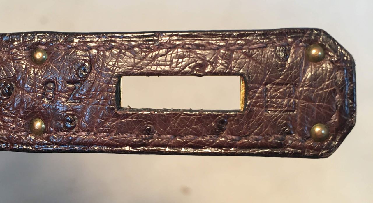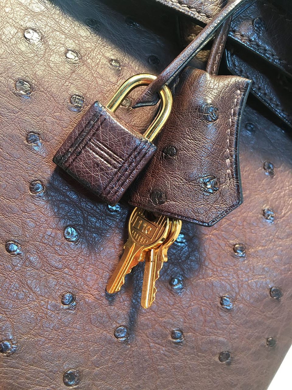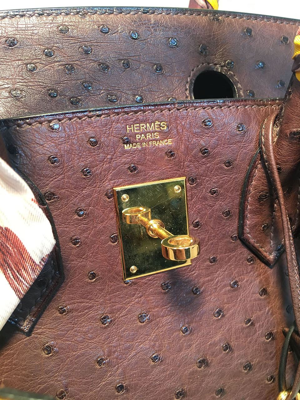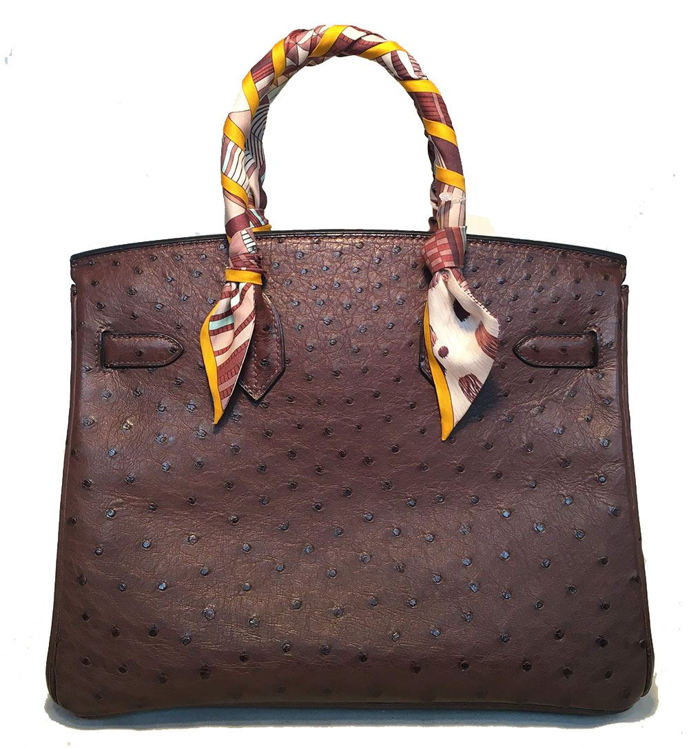 STUNNING Hermes Brown Ostrich 30cm Birkin Bag in excellent condition. Brown ostrich leather exterior trimmed with gold hardware and matching ostrich clochette with gold keys and lock. Signature twist double strap flap closure opens to a brown kidskin lined interior that holds just enough space for your essentials and one side slit and one side zippered side pockets. Overall excellent condition. No stains, smells or scuffs. Clean corners, edges and interior. Stamped square E means 2001 production. Perfect 30cm size. Exotic ostrich leather and neutral brown color coordinates with any ensemble in a variety of seasons. Purchase includes a dust cover, box, raincoat and matching clochette and lock and keys. Measurements: 11.5"x9.5"x6" 3.5" handle drop#Bags1186