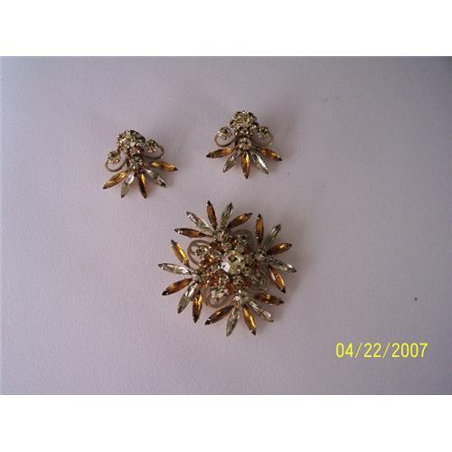For sale is a drop dead STUNNING AND GORGEOUS signed Judy Lee 2-piece Rhinestone Demi Parure set. The brooch and earrings are just out of this world! It?s so much prettier looking at it in person! It?s set in goldtone and the stones are prong set. There is a darker amber colored rhinestones and lighter amber colored rhinestones. I guarantee you that you will NOT be disappointed in owning this set.
