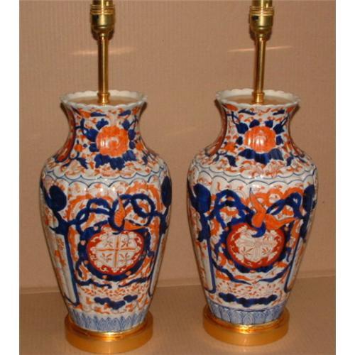 Stunning Pair of Traditional Imari Vases of impressive proportions, now converted to electric Table Lamps with ormolu bases and mounts. The main outer bodies with all over typical decorative palette in colours of iron red dark blue on an off white ground. Mid to late Nineteenth Century. <p>