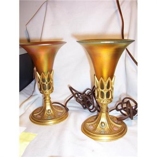 STUNNING PAIR QUEZAL ART GLASS LAMPS & SHADES. STORED AWAY FOR MANY YEARS. GUARANTEED OLD.