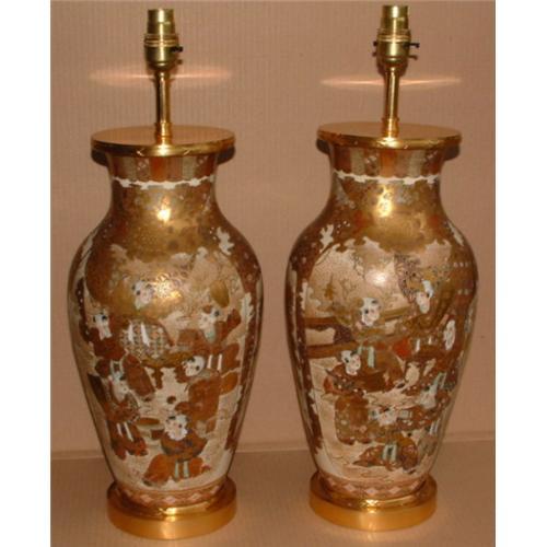 Stunning Pair of Satsuma Vases of impressive proportions, now converted to electric Table Lamps with ormolu bases and mounts. The main outer bodies with lavish typical decorative palette in colours, last quarter of Nineteenth Century. <p>