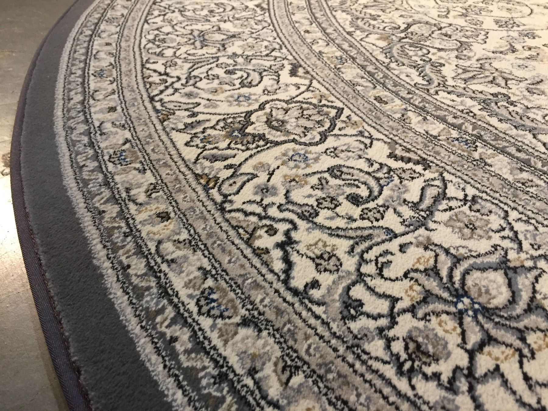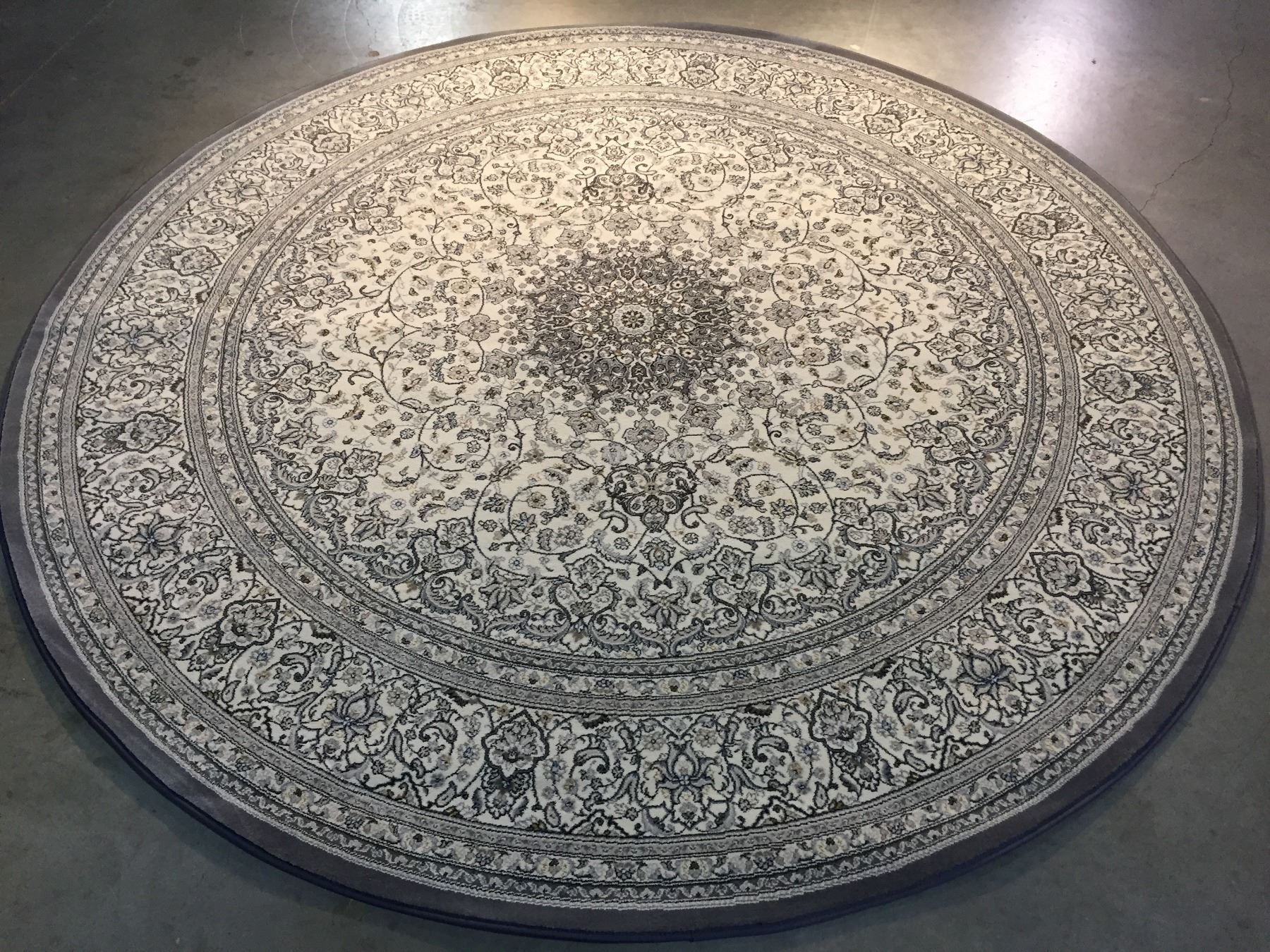 8'x8' Round Top of line Belgium made Brand name rug, in Classic Persian Isfahan intricate and detailed pattern Premium quality 1.0 M PPSM dense pile in up to date colors, Ivory,Grey, and multi accent colors ,Made of durable and easy to care, polyproplyen pile power loom in Belgium