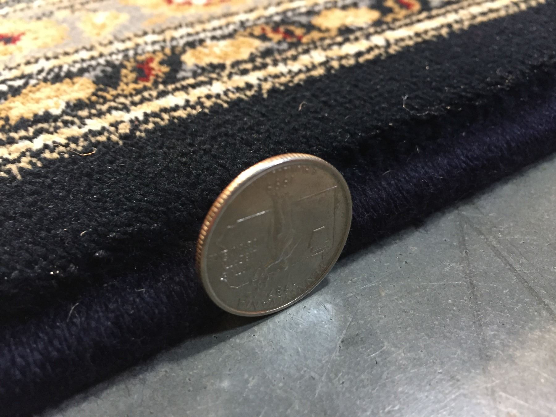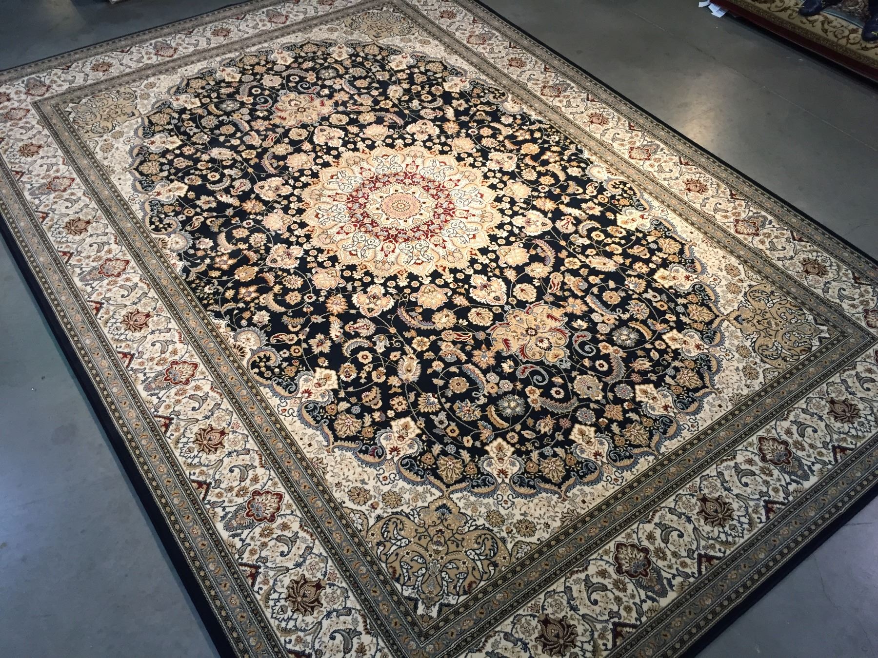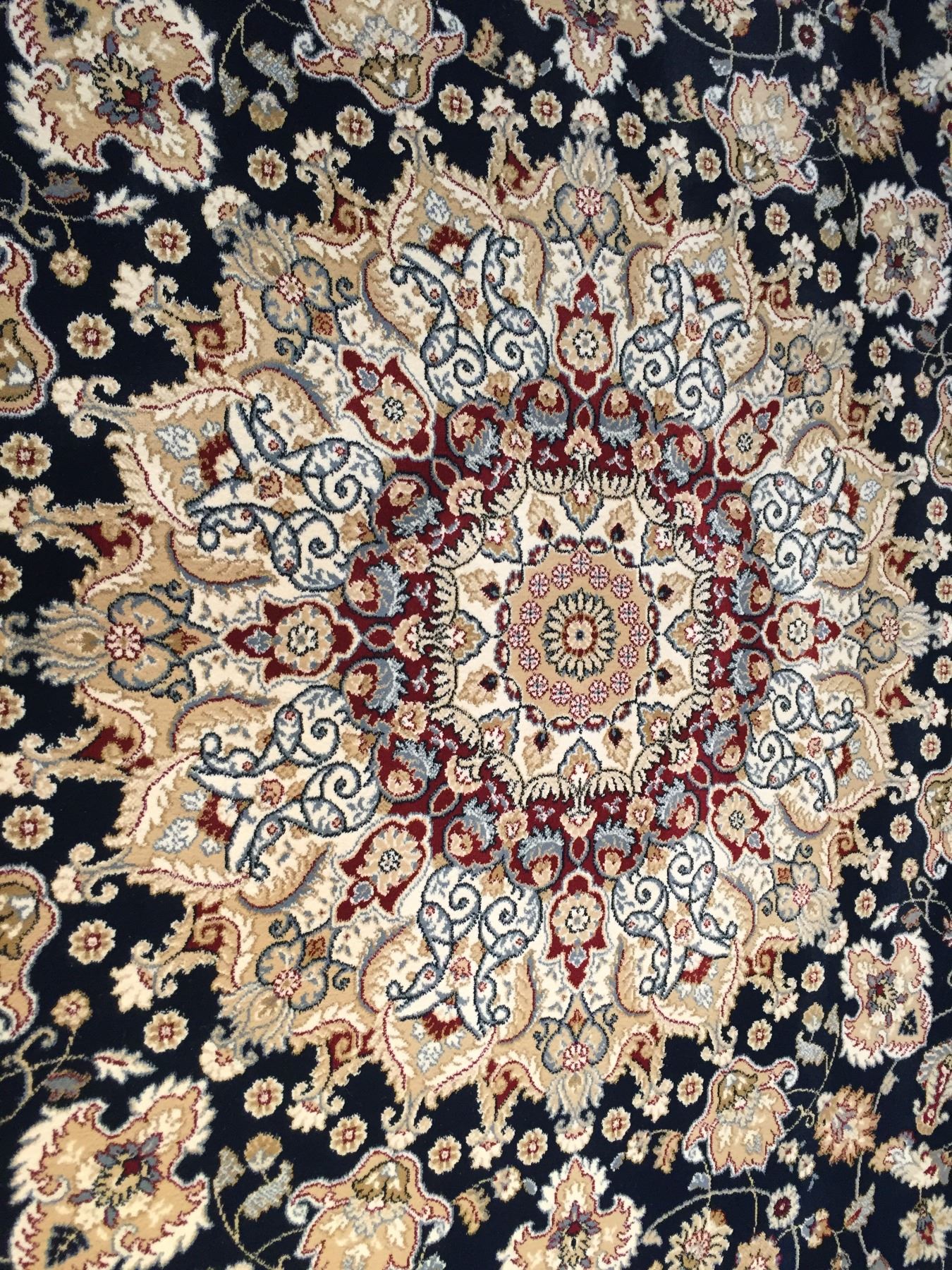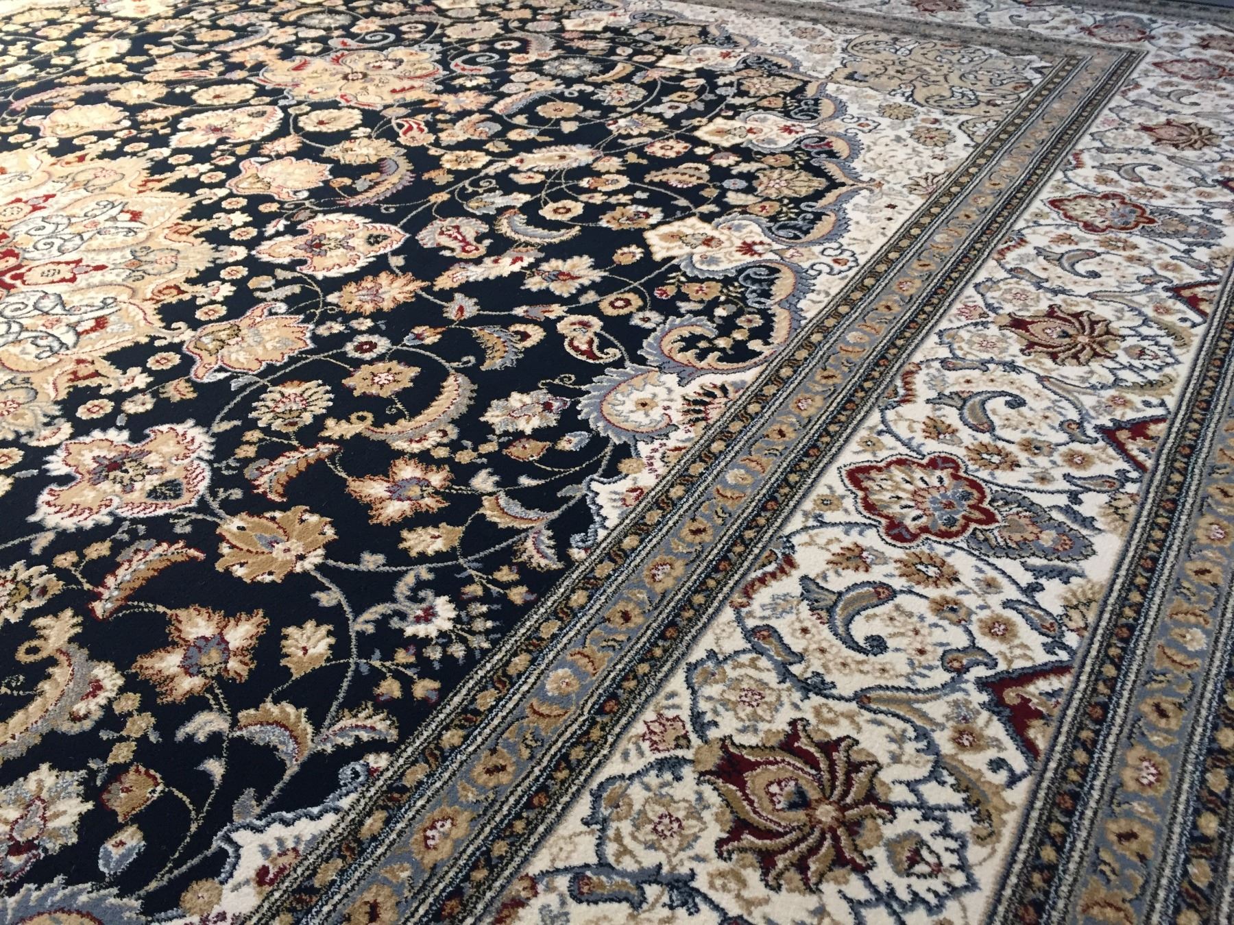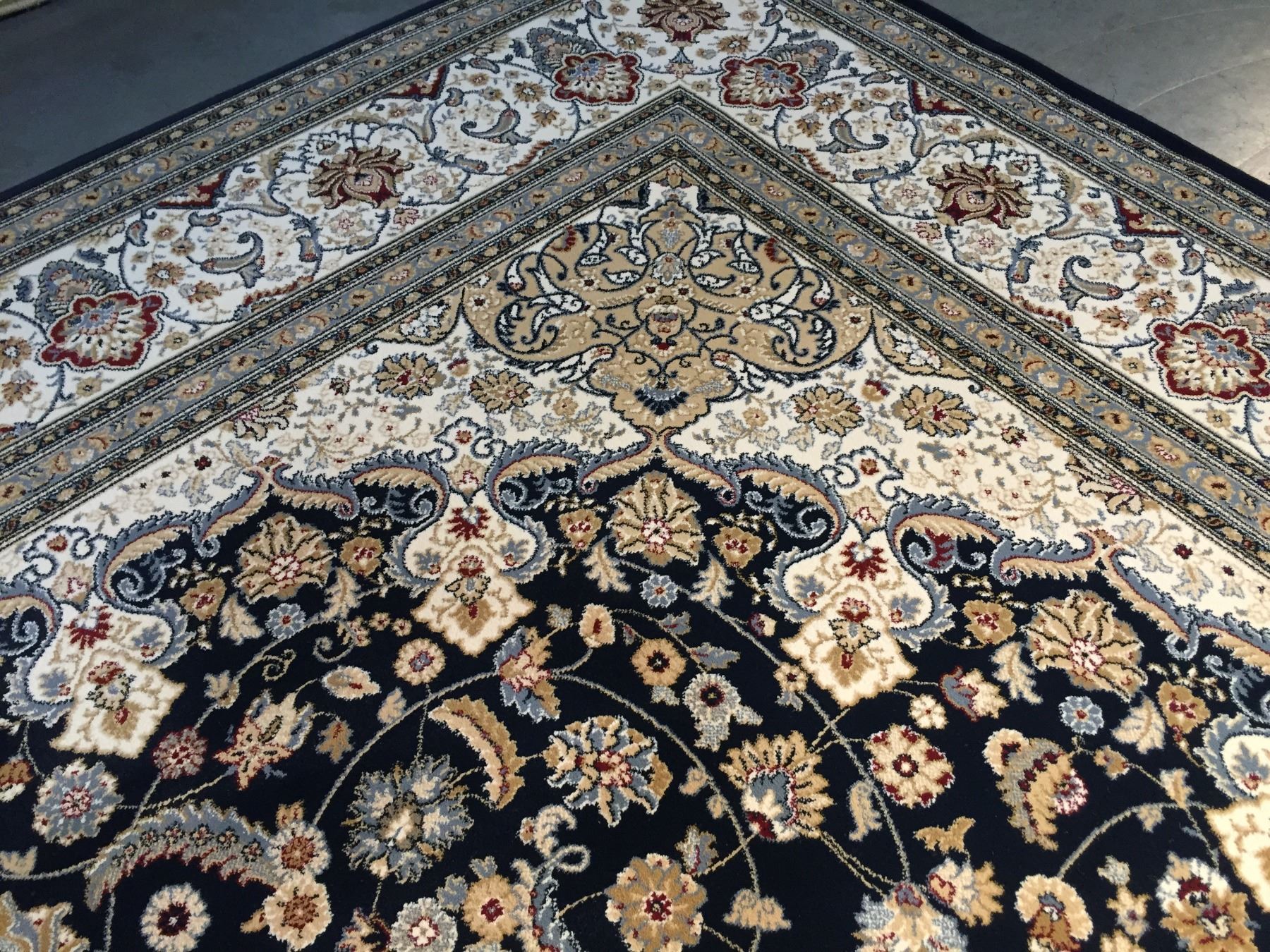 7'.10"x11'.2" Top of line Belgium made Brand name rug, in Persian Isfahan intricate and detailed pattern Premium quality 1.0 M PPSM dense pile in rich Navy Blue, Ivory, and multi accent colors ,Made of durable and easy to care, polyproplyen pile power loom in Belgium