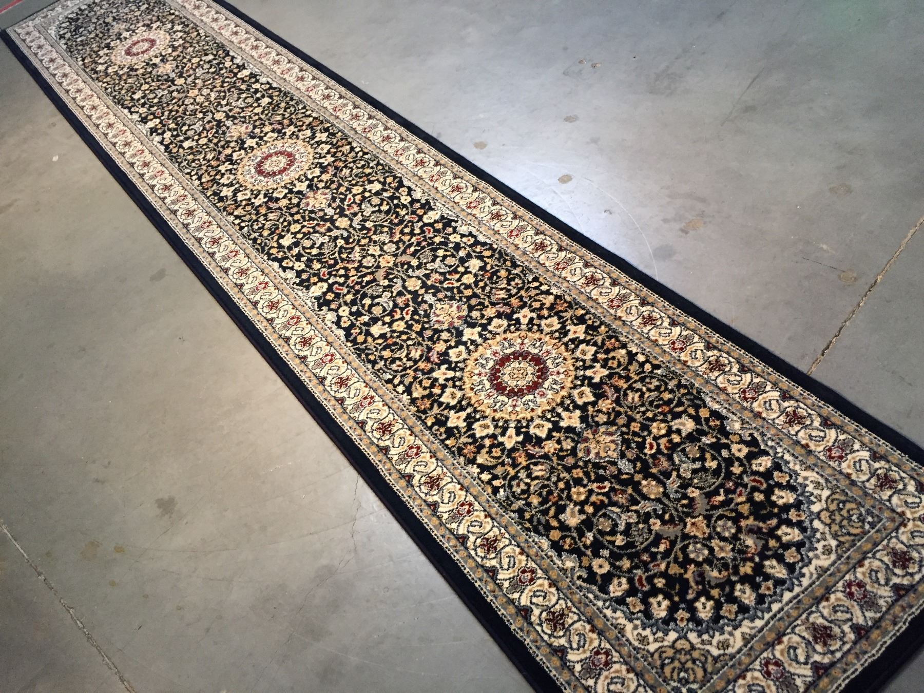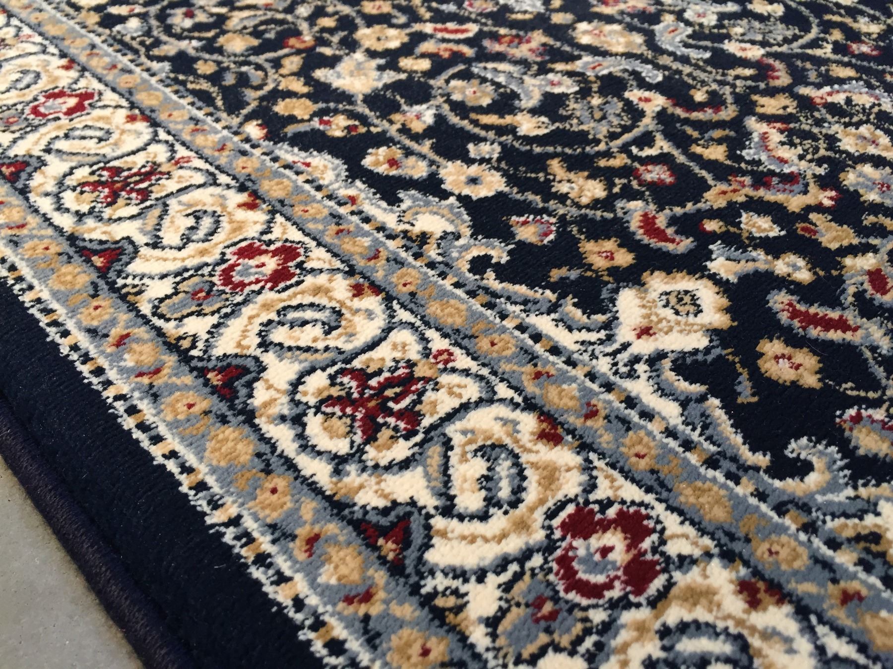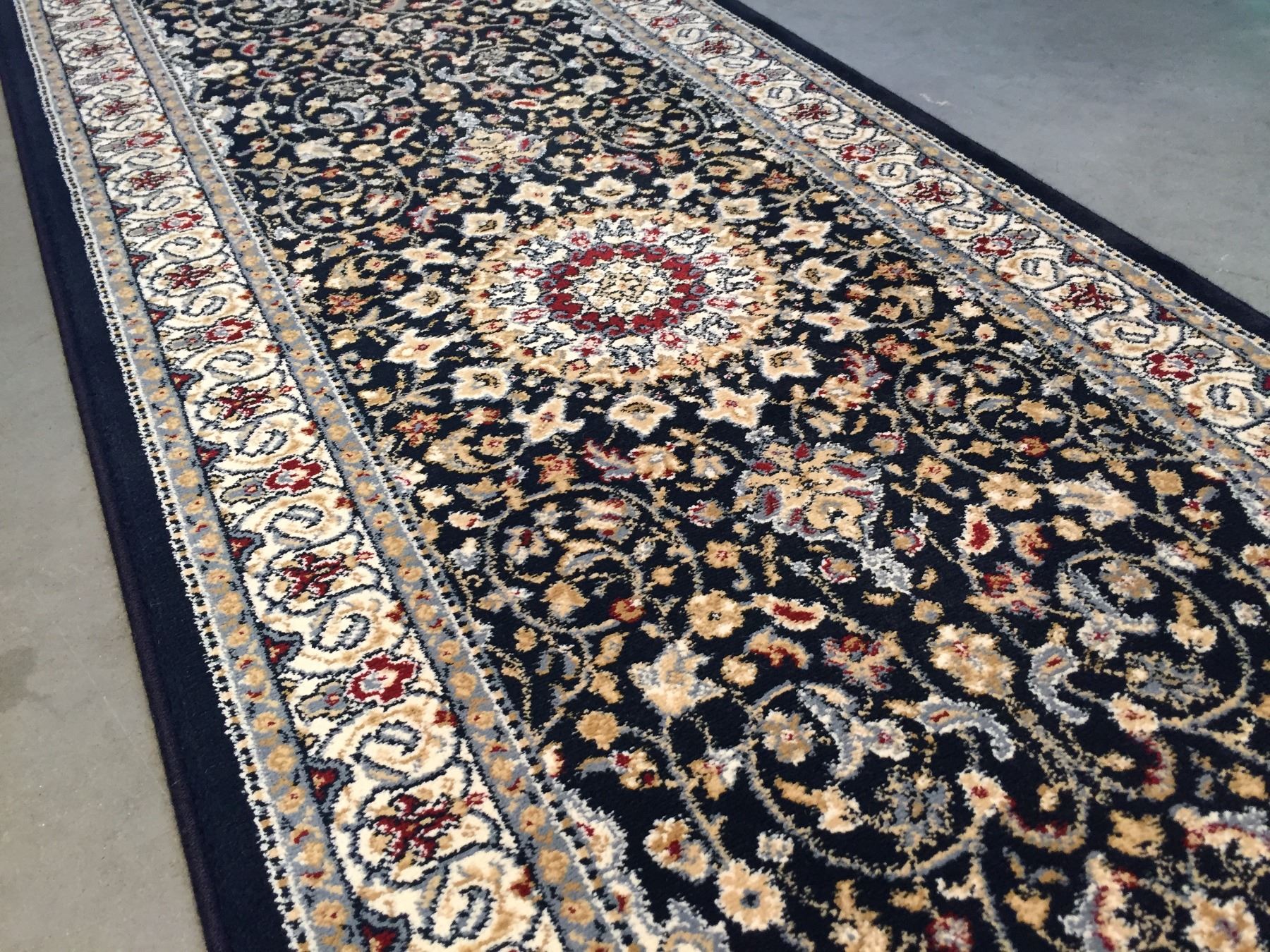 2'.3"x11'.0" Top of line Belgium made Brand name rug, in Persian Isfahan intricate and detailed pattern Premium quality 1.0 M PPSM dense pile in rich Navy, and multi accent colors ,Made of durable and easy to care, polyproplyen pile power loom in Belgium.