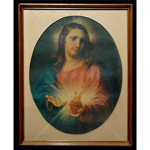 This is a striking print of Jesus depicted with his heart in his hand.Jesus has a sad expression and is offering his heart to the mankind.The print is in good condition and in a wood frame.
