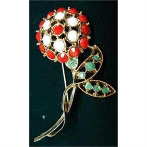 BEAUTIFUL DETAILED BROOCH, IT DEPICTS LOVELY FLOWER BROOCH, STONES ARE WHITE. RED AND GREEN MILK GLASS - as per pictures,EXCELLENT - MINT CONDITION - BROOCH MEASURES ABOUT 2 1/2" long, US BUYER TO PAY 7.00 FOR SHIPPING PLUS INSURANCE,THANKS.