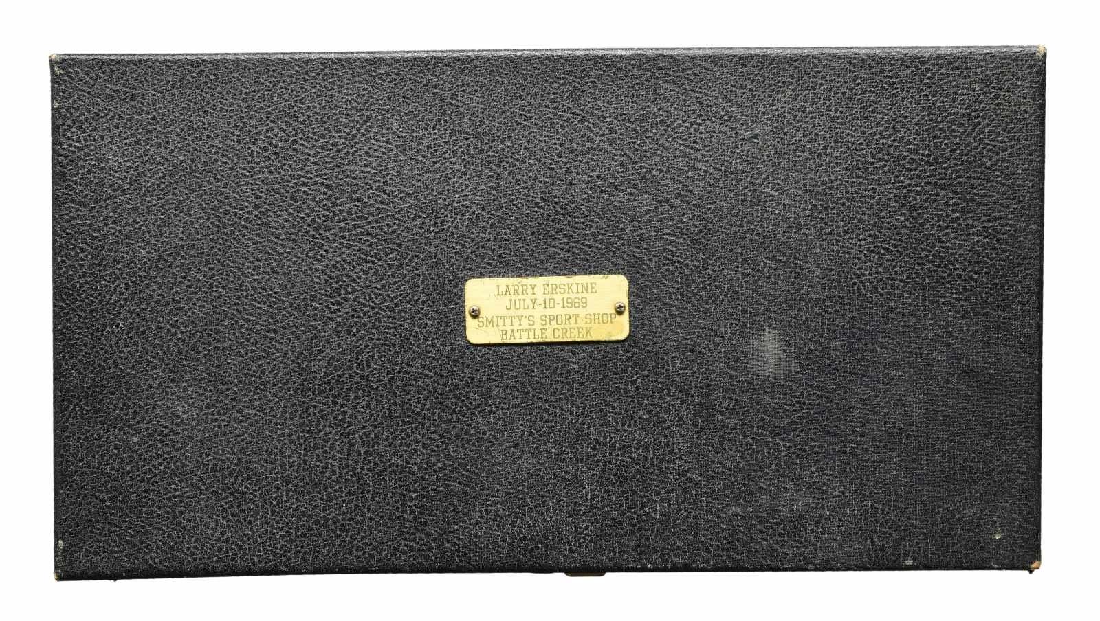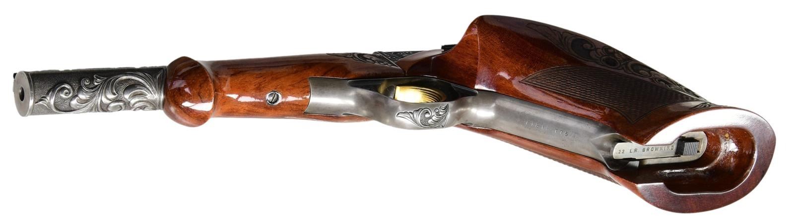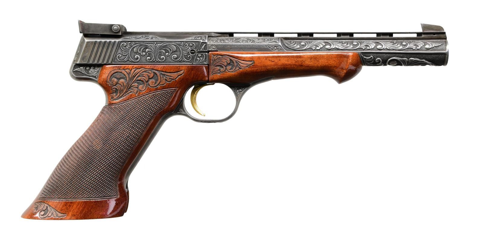 SEMI-AUTOMATIC PISTOL WITH CASE & ACCESSORIES. Cal. 22 LR. S# 71818T75. Bbl.6 3/4". Medalist semi-automatic pistol mfg. in Belgium in 1975 and imported by Brown Arms Company. The left side of the bbl. is marked "BROWNING ARMS COMPANY/ MORGAN, UTAH & MONTREAL P.Q.", with ".22 L.R. BROWNING PATENTS/ MADE IN BELGIUM" marked on the right. The slide and bbl. exhibit extensive bordered relief engraved scrollwork on a matte punch dot background, with matching bordered scroll engraving present on the rear of the frame, as well as some light scroll engraved on the trigger guard and trigger guard webs. Underside of bbl. and left side of slide exhibit Belgian proofs. The original blue finish has been purposefully removed, with the balance now retaining a pleasing dull gray patina overall. Trigger retains its gold finish. Frame is mounted with a 1-piece checkered wood grip and schnabel tip "forend", with both featuring scroll engraving on either side. MAGS: 1 10-rd. UNATTACHED ACCESSORIES: standard Medalist black leatherette case, featuring a red fabric interior and containing 1 wood ammunition block, 4 target weights, 1 screwdriver, as well as an original manual. Case lid retains its brass plaque, which is engraved "LARRY ERSKINE/ JULY-10-1969/ SMITTY'S SPORT SHOP/ BATTLE CREEK". CONDITION: excellent, with the finish seemly purposefully removed and metal components retaining the aforementioned gray patina, with some small scattered spots of age related discoloration. Mirror bore, exhibiting a few small concentrated spots of light to mild pitting, while retaining well defined rifling throughout. Grip and forend are excellent, exhibiting a few minor superficial handling marks overall. Case exhibits some exterior wear from handling and storage, but otherwise remains sturdy and serviceable. An exceptionally attractive, professionally executed relief engraved Belgian Browning Medalist pistol that is sure to be an eye catching example in one's collection. (24-1986/MLW). MODERN. $3,500-5,000.
