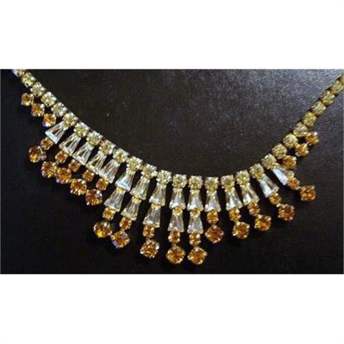 </font></strong>STUNNING RHINESTONE NECKLACE - MADE FROM AMAZING VARIATION OF RHINESTONES IN TWO COLORS:, OLD GOLD AND CRYSTAL CLEAR, EVERY STONE IS PERFECT AND HAND SET AND SECURED WITH NUMBER OF CLAWS, (NO GLUE JOB HERE) as per images, excellent condition, measures about 17" long, US Buyer to pay 7.00 for shipping plus insurance.THANKS.</font>