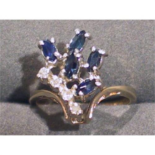 OFFERING A MAGNIFICENT SIGNED 10 KARAT TWO TONE GOLD "FANCY" MARQUISE CUT BLUE SAPPHIRE AND DIAMOND COCKTAIL/DINNER RING!!! THIS FABULOUS RING IS FROM THE ESTATE OF A FORMER HAWAII STATE SENATOR AND HIS WIFE WHO COLLECTED JEWELRY AND ANTIQUES FOR OVER 50 YEARS!!! THE WORKMANSHIP AND DETAIL ON THIS INCREDIBLE FANCY CUT SAPPHIRE AND DIAMOND RING IS EXCEPTIONAL AND OF VERY FINE QUALITY!!! THIS FANTASTIC RING COMPRISES OF 5 EXTREMELY GORGEOUS BLUE SAPPHIRES AND 4 DIAMONDS, AND IT MEASURES 5/8" BY 1/2" AND I ESTIMATE THE RING SIZE TO BE BETWEEN 4 AND 5, AND IT IS IN EXCELLENT CONDITION!!! THIS SPECTACULAR RING IS A MUST FOR THE ESTATE, COCKTAIL/DINNER OR SAPPHIRE AND DIAMOND RING COLLECTOR AND IS AN OPPORTUNITY THAT SHOULD NOT BE MISSED!!! (ALL STONES ARE GUARANTEED AS NATURAL AND GENUINE!!!)