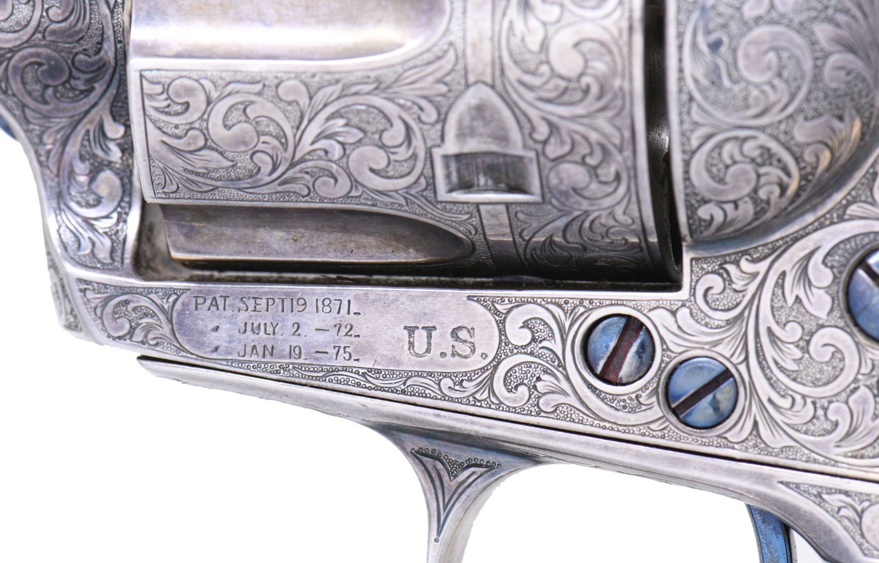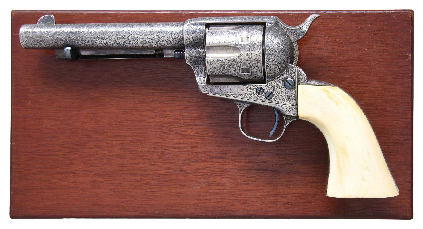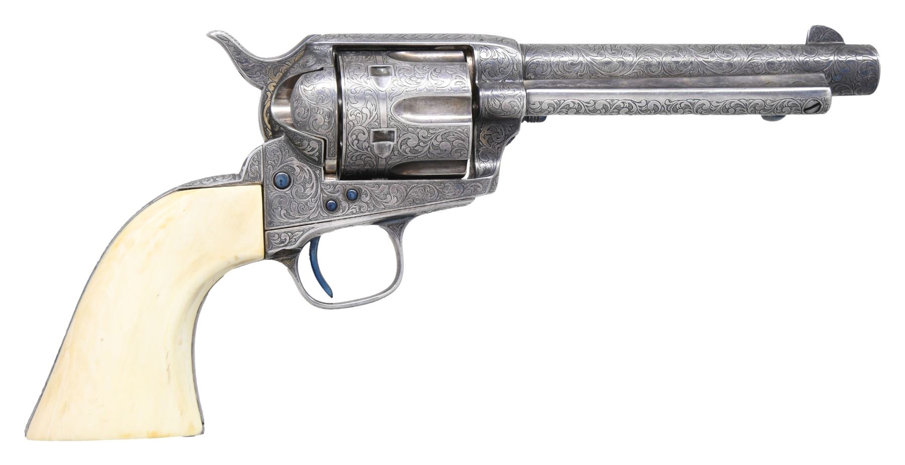 SINGLE ACTION ARMY REVOLVER WITH DISPLAY CASE. Cal. 45. S# 138934. Bbl. 5 1/2". Single Action Army revolver mfg. by Colt in 1891 and later professionally restored and engraved. The top of the bbl. is marked with a hand engraved "COLT'S PT FA MFG Co HARTFORD CT USA", with Colt's patent information, followed by an engraved "U.S." on the left side of the frame. This example features professionally executed, near full coverage bordered scroll engraving on a fine punch dot background. Ejector rod housing features matching pattern scroll engraving on the side, and a wavy line and dot pattern engraved over the top, with the top strap featuring an intertwined line pattern on either side of the sight groove. Metal components exhibit a professionally reapplied silver plated finish, with some small parts including the ejector rod, cyl. base pin, trigger, and frame screws exhibiting a reapplied nitre blue finish. Frame is mounted with a 2-piece smooth white grip. SAA pattern blade front sight (appears to be been slightly shortened), with frame notched rear sight. S# on frame appears to have been enhanced. Trigger guard and rear grip strap have been renumbered to match. Cyl. is unnumbered. UNATTACHED ACCESSORIES: contemporary wood display case, featuring a navy blue felt lining, containing a wood handled cleaning rod marked "ANTOINE COURTOIS/ MILLSR/ PARIS". CONDITION: excellent, as professionally restored, with metal components retaining bountiful amounts of their reapplied silver plated finish, exhibiting some spots of pitting beneath the plating in protected areas, as well as some spots of light bubbling. Nitre blued parts show some light to mild wear and thinning. Very bright bore, as refinished, exhibiting areas of dark mild pitting, while retaining strong rifling throughout. Grip is very good, showing some age related discoloration, as well as some superficial handling marks. Case shows some superficial marks from handling and storage, but otherwise remains sturdy and serviceable. Interior of case shows varying degrees of chipping along the inner edge. (01-26623/MLW). ANTIQUE. $2,000-4,000.