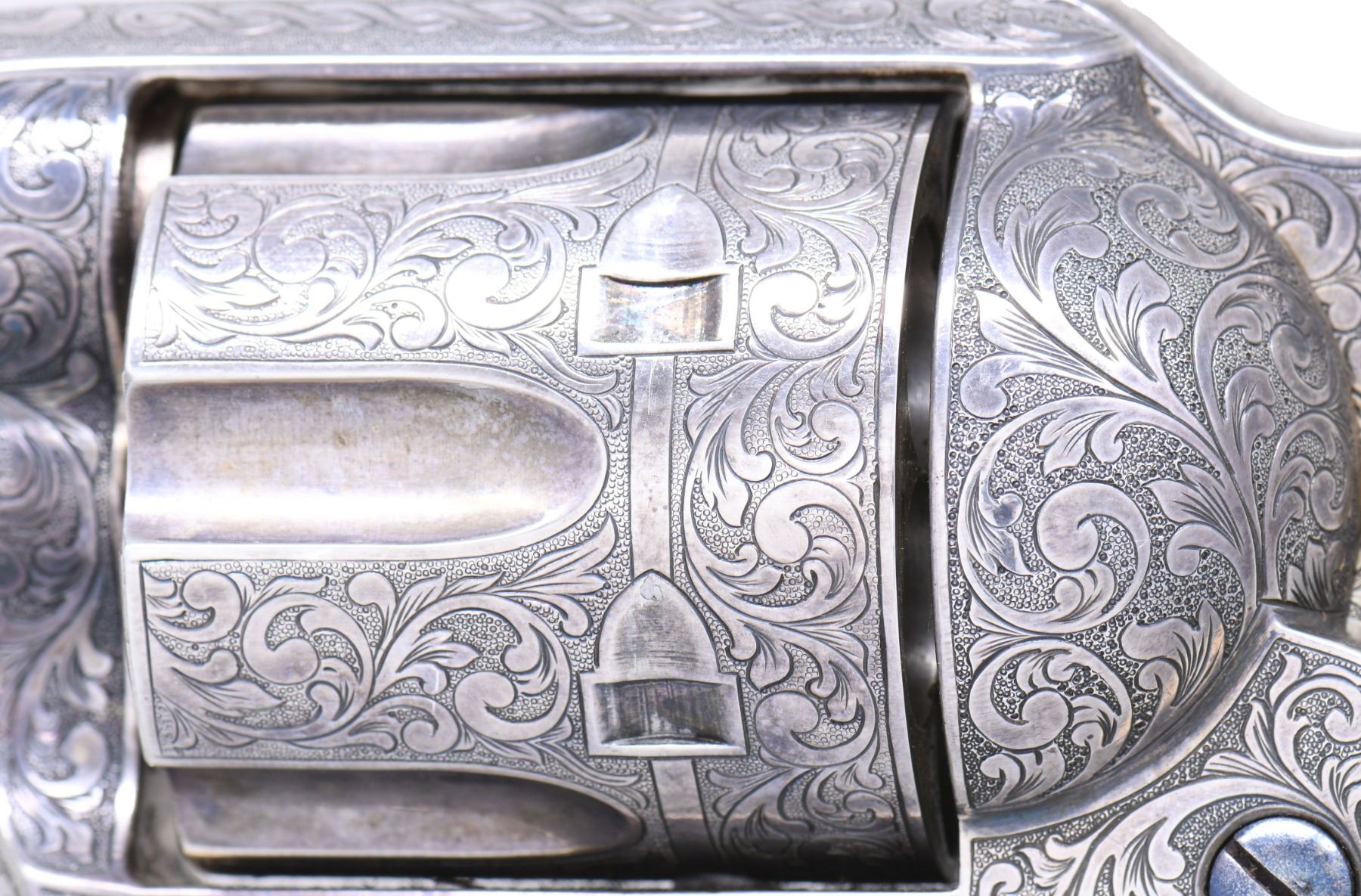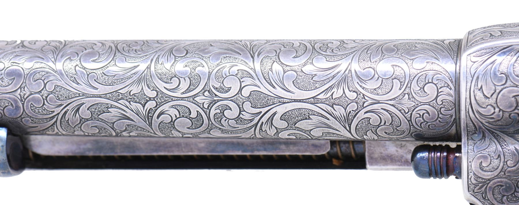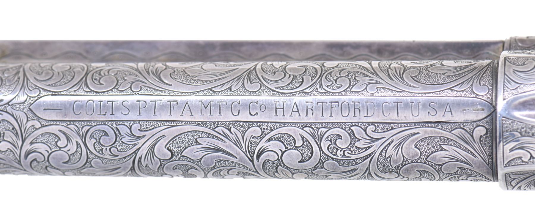 SINGLE ACTION ARMY REVOLVER WITH DISPLAY CASE. Cal. 45. S# 138934. Bbl. 5 1/2". Single Action Army revolver mfg. by Colt in 1891 and later professionally restored and engraved. The top of the bbl. is marked with a hand engraved "COLT'S PT FA MFG Co HARTFORD CT USA", with Colt's patent information, followed by an engraved "U.S." on the left side of the frame. This example features professionally executed, near full coverage bordered scroll engraving on a fine punch dot background. Ejector rod housing features matching pattern scroll engraving on the side, and a wavy line and dot pattern engraved over the top, with the top strap featuring an intertwined line pattern on either side of the sight groove. Metal components exhibit a professionally reapplied silver plated finish, with some small parts including the ejector rod, cyl. base pin, trigger, and frame screws exhibiting a reapplied nitre blue finish. Frame is mounted with a 2-piece smooth white grip. SAA pattern blade front sight (appears to be been slightly shortened), with frame notched rear sight. S# on frame appears to have been enhanced. Trigger guard and rear grip strap have been renumbered to match. Cyl. is unnumbered. UNATTACHED ACCESSORIES: contemporary wood display case, featuring a navy blue felt lining, containing a wood handled cleaning rod marked "ANTOINE COURTOIS/ MILLSR/ PARIS". CONDITION: excellent, as professionally restored, with metal components retaining bountiful amounts of their reapplied silver plated finish, exhibiting some spots of pitting beneath the plating in protected areas, as well as some spots of light bubbling. Nitre blued parts show some light to mild wear and thinning. Very bright bore, as refinished, exhibiting areas of dark mild pitting, while retaining strong rifling throughout. Grip is very good, showing some age related discoloration, as well as some superficial handling marks. Case shows some superficial marks from handling and storage, but otherwise remains sturdy and serviceable. Interior of case shows varying degrees of chipping along the inner edge. (01-26623/MLW). ANTIQUE. $2,000-4,000.
