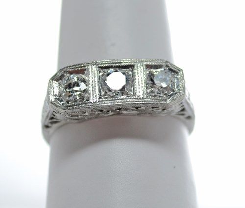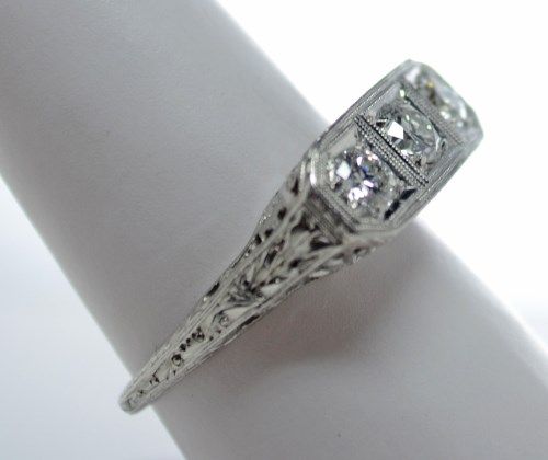 Size 7 3/4 approx .90 ctw all 3 stones have an approx. clairity of SI2 and an approx color grade of G 3.0dwt If you love the vintage filigree look you'll love this ring!
