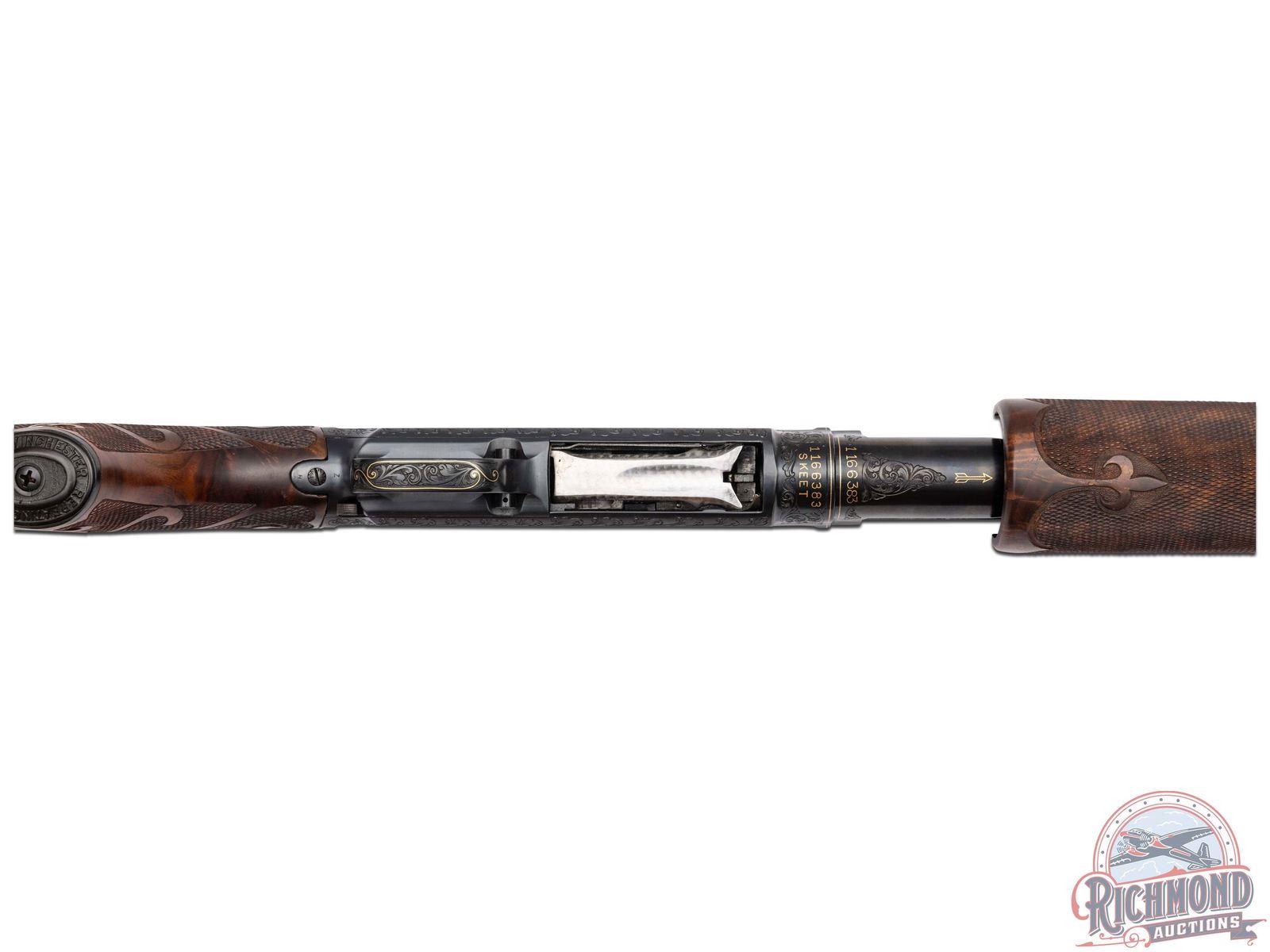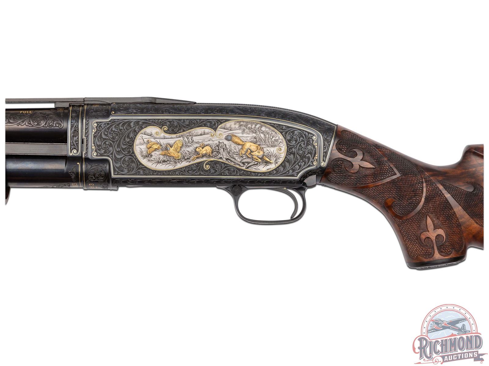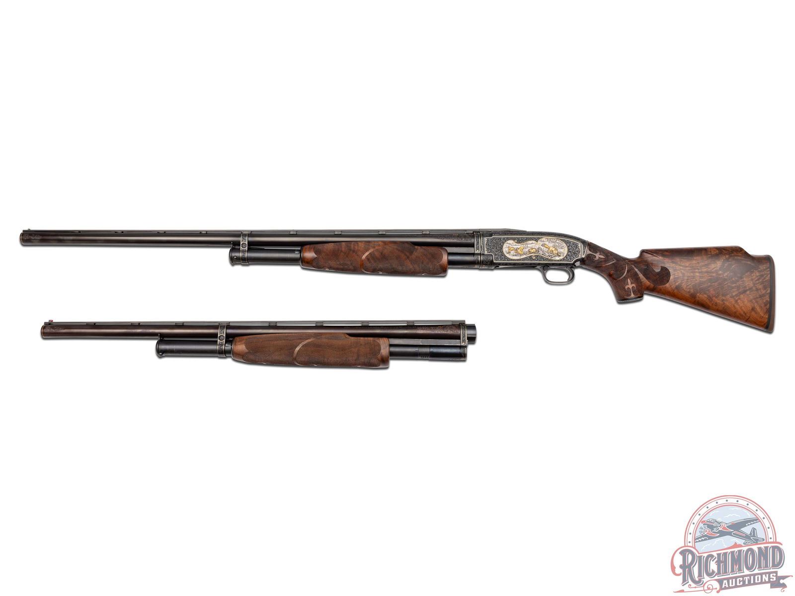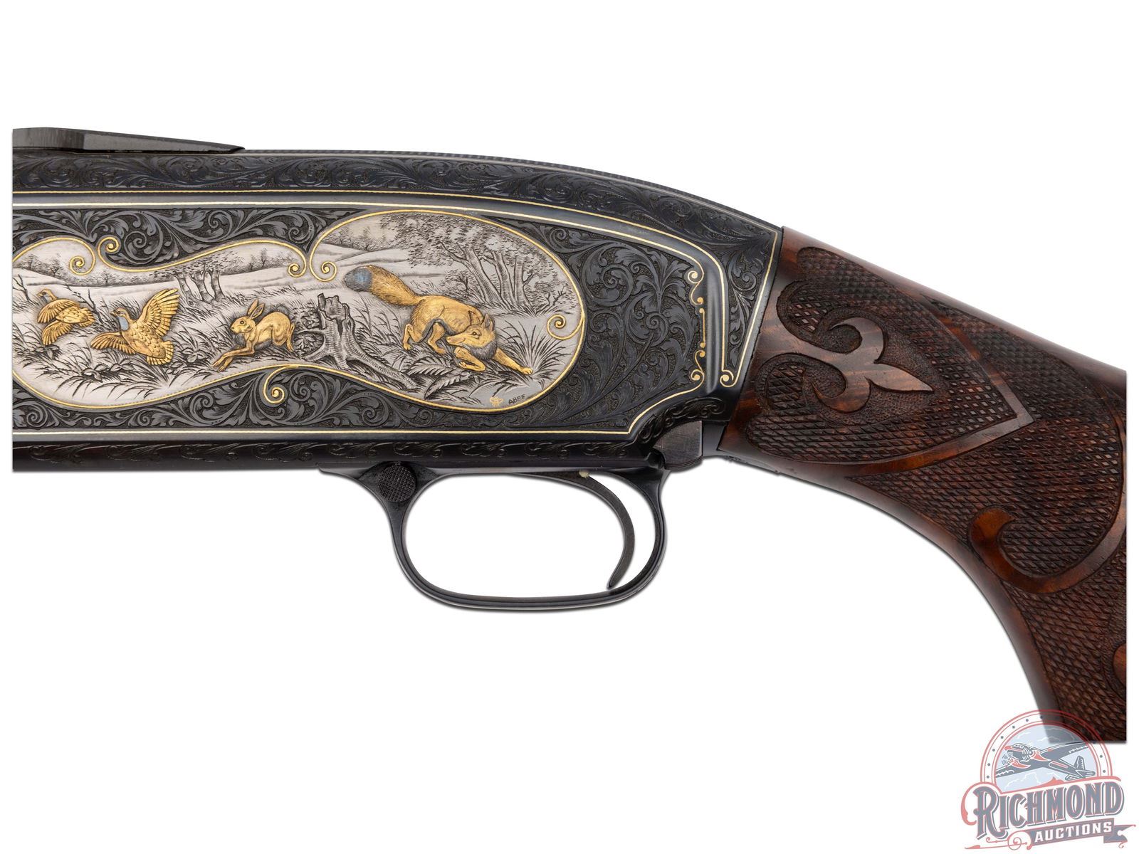 Manufactured in 1949. Two barrel set with matching serial numbers in gold lettering. First features a Skeet 30" blued barrel with ventilated rib and nickel md-bead mid and front sight. Chambered for 2-3/4" shells with gold lettered "FULL" choke. Bottom is marked "SKEET" in gold lettering. Second barrel is a 26" with ventilated rib and white bead mid and red bead front sight. Chambered for 2-3/4" shells with gold lettered "WS-1" choke. Both barrels feature Winchester proof marks in gold on barrel. Floral scroll engraving extends 1-1/4" from the gold lined muzzle and 3" from the receiver on both sides of each barrel. Magazine barrel clamp also has matching engraving with gold lined border on both. Gorgeous receiver features 95% engraved coverage by master engraver Angelo Bee, signed on the left side. Left side features a coin finish woodland game scene bordered in gold scroll with a gold embossed fox, rabbit and two grouse in flight. Surrounded with floral scroll design all bordered in gold. Right side features a coin finish woodland game scene bordered in a gold scroll with three gold embossed turkeys. All surrounded with floral scroll design and bordered in gold. Diamond cut bolt and lifter. Bottom of trigger guard features floral scroll engraving with a gold scroll border. Beautifully figured Winchester custom shop feather crotch walnut stock and forearms featuring factory B carving likely done by Edward Kaik. Hand-carved fleur-de-lis hand-checkering on the pistol grip and both forearms. Fitted with a factory Winchester pistol grip cap and a black lined brown rubber recoil pad. LOP: 13-3/4". DAC: 1-1/2". DAH: 2". CALIBER: 12 GA. S/N: 1166383. FFL STATUS: Curio & Relic.