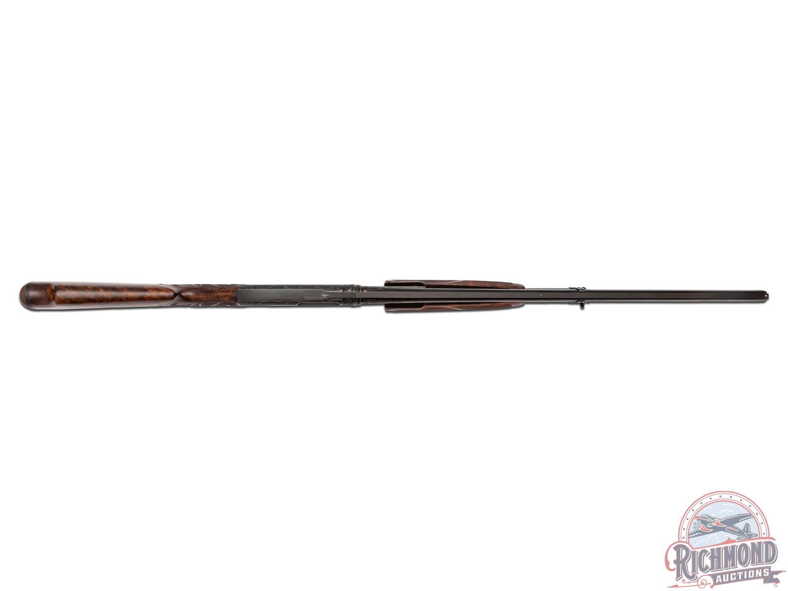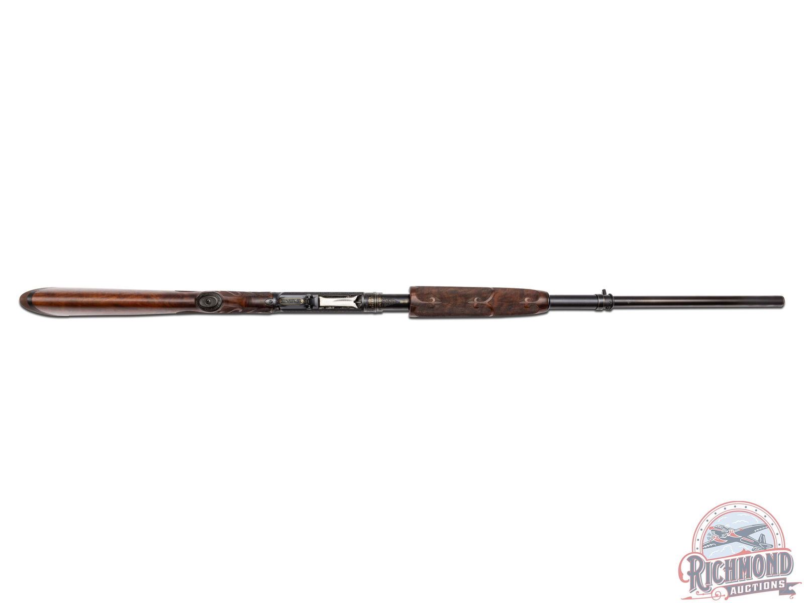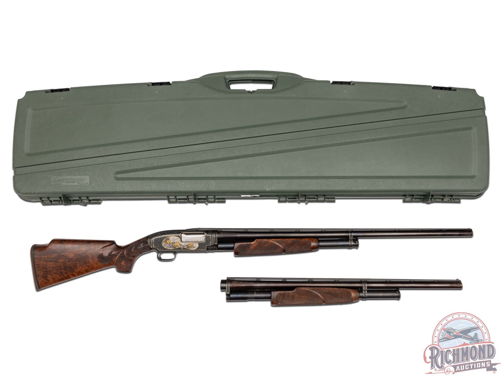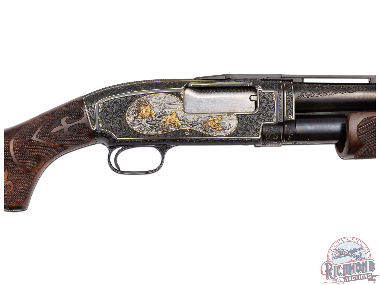 Manufactured in 1949. Two barrel set with matching serial numbers in gold lettering. First features a Skeet 30" blued barrel with ventilated rib and nickel md-bead mid and front sight. Chambered for 2-3/4" shells with gold lettered "FULL" choke. Bottom is marked "SKEET" in gold lettering. Second barrel is a 26" with ventilated rib and white bead mid and red bead front sight. Chambered for 2-3/4" shells with gold lettered "WS-1" choke. Both barrels feature Winchester proof marks in gold on barrel. Floral scroll engraving extends 1-1/4" from the gold lined muzzle and 3" from the receiver on both sides of each barrel. Magazine barrel clamp also has matching engraving with gold lined border on both. Gorgeous receiver features 95% engraved coverage by master engraver Angelo Bee, signed on the left side. Left side features a coin finish woodland game scene bordered in gold scroll with a gold embossed fox, rabbit and two grouse in flight. Surrounded with floral scroll design all bordered in gold. Right side features a coin finish woodland game scene bordered in a gold scroll with three gold embossed turkeys. All surrounded with floral scroll design and bordered in gold. Diamond cut bolt and lifter. Bottom of trigger guard features floral scroll engraving with a gold scroll border. Beautifully figured Winchester custom shop feather crotch walnut stock and forearms featuring factory B carving likely done by Edward Kaik. Hand-carved fleur-de-lis hand-checkering on the pistol grip and both forearms. Fitted with a factory Winchester pistol grip cap and a black lined brown rubber recoil pad. LOP: 13-3/4". DAC: 1-1/2". DAH: 2". CALIBER: 12 GA. S/N: 1166383. FFL STATUS: Curio & Relic.