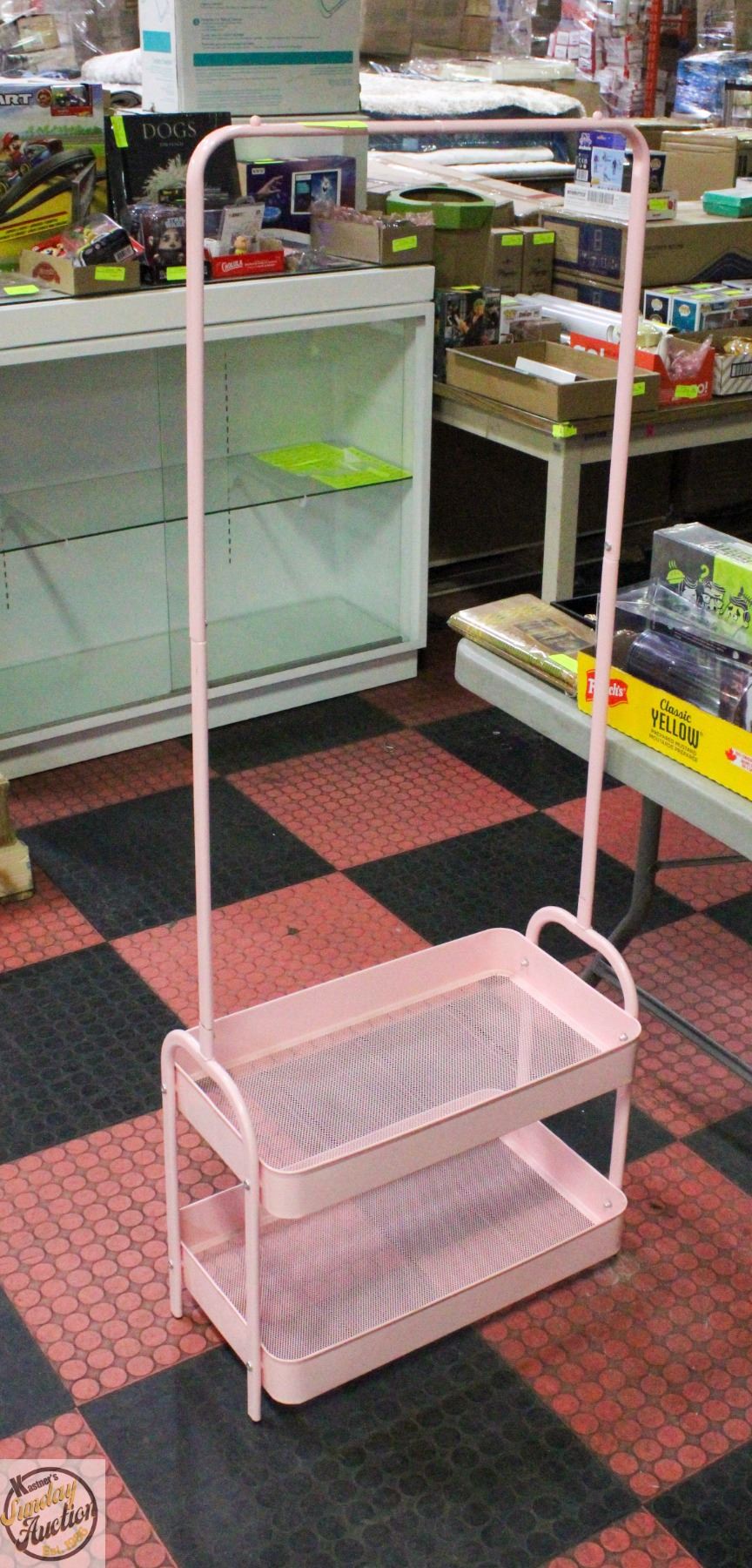 HANGING RACK - TWO BASKET STORAGE SHELVES WITH TOP HANGING RACK, MULTI-PURPOSE: TOY AND DRESS-UP, LAUNDRY, CLOSET, ETC. (21.75"L X 12.5"W X 57"H) **ALL ITEMS MUST BE REMOVED BY 5PM SATURDAY, DECEMBER 6TH 2025. ALL REMAINING ITEMS WILL BE SUBJECT TO A $6.00 PER DAY STORAGE CHARGE. ANY ITEMS REMAINING AFTER MONDAY, DECEMBER 22ND 2025 WILL BE CONSIDERED FORFEITED. NO REFUNDS WILL BE ISSUED FOR FORFEITED ITEMS. TO SCHEDULE A PICK UP APPOINTMENT CLICK HERE