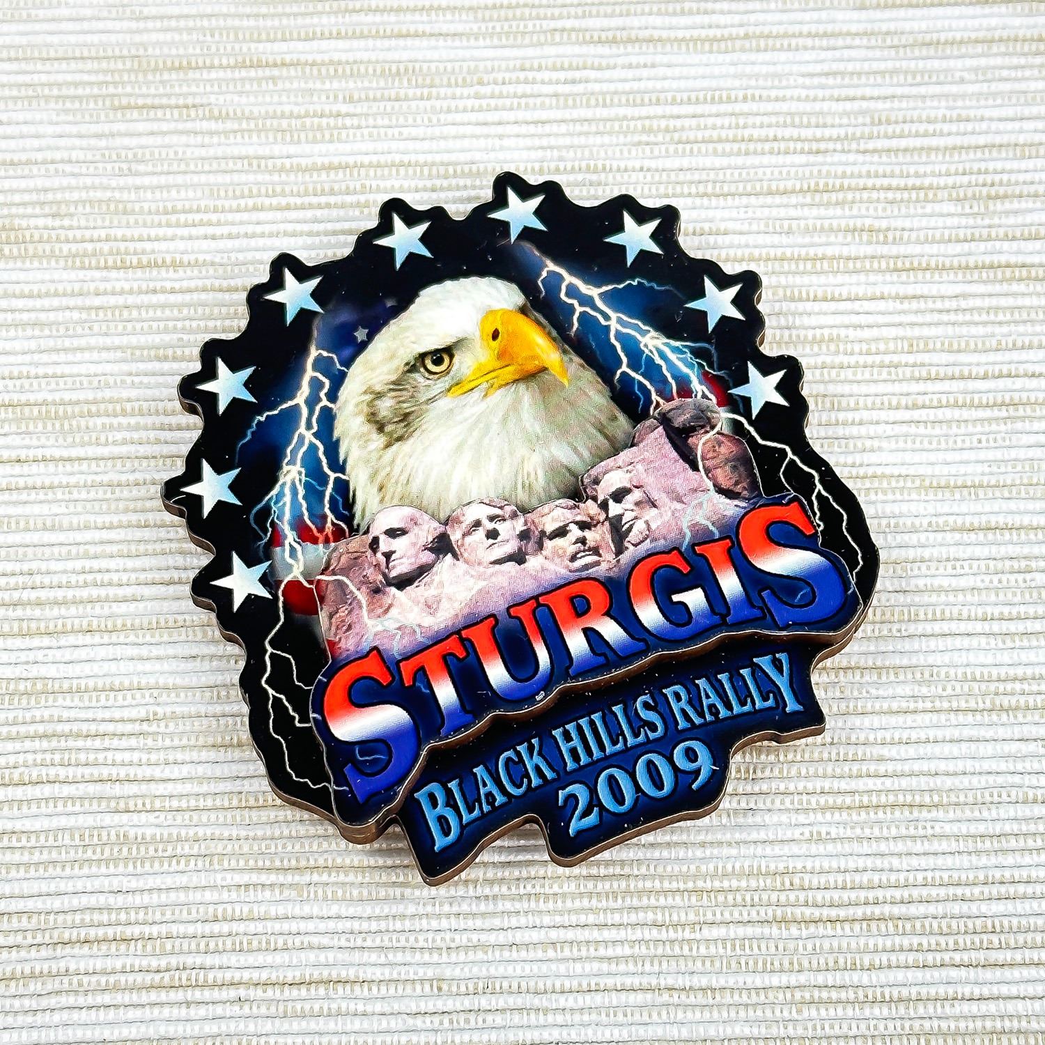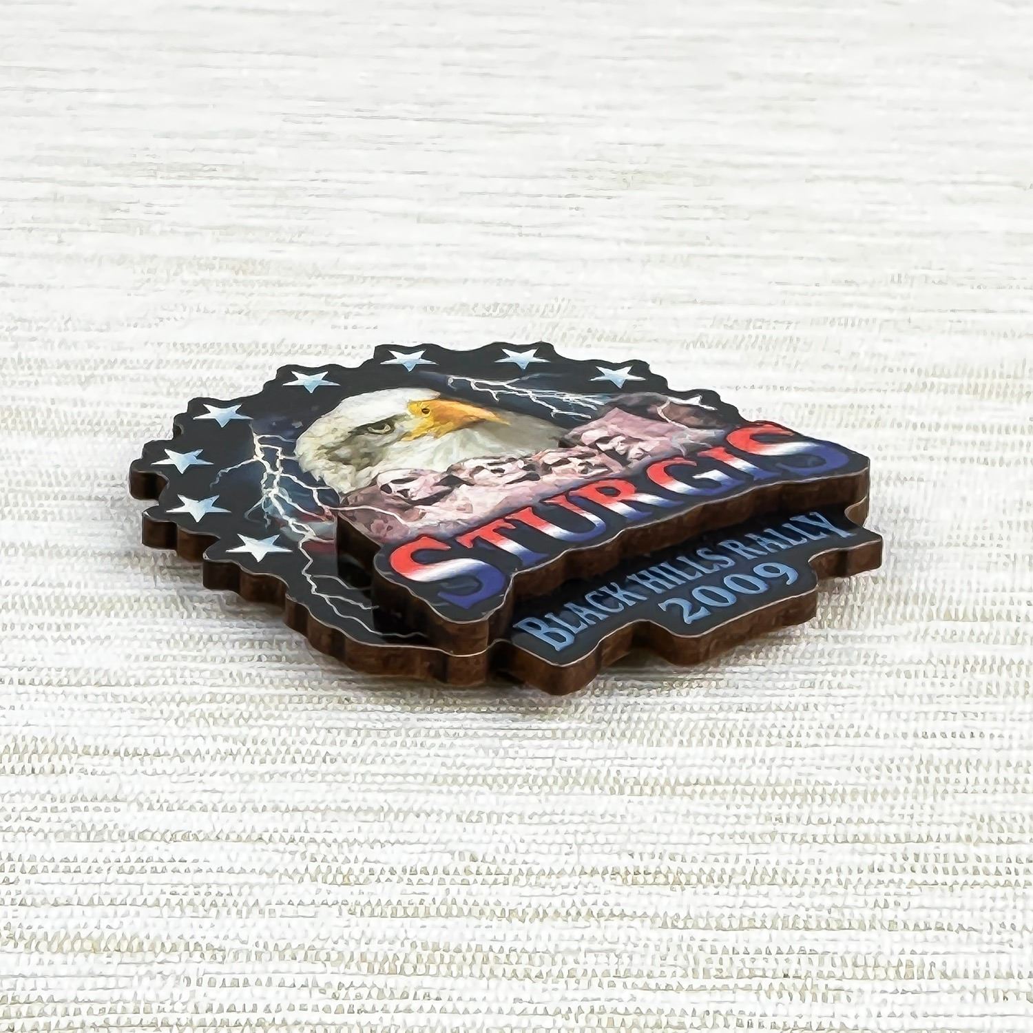 #8676 - 69TH ANNUAL 2009 STURGIS, SOUTH DAKOTA BLACK HILLS MOTORCYCLE RALLY - 2.75” X 2.5” 3D WOODEN FRIDGE MAGNET - COLLECTIBLE STURGIS SOUVENIR - EAGLE & MOUNT RUSHMORE