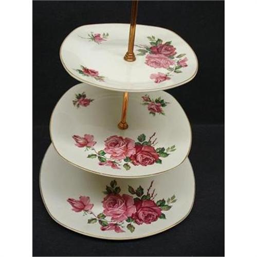 FABULOUS 3 TIER STAND-SERVER, MADE BY STYLECRAFT, FASHION TABLEWARE BY MIDWINTER, STAFFORDSHIRE OF ENGLAND.IN EXCELLENT CONDITION BUT FOR A VERY FINE HAIRLINES AROUND THE POSTS, WHICH IS VERY COMMON OCCURrENCE ON THESE STANDS WITH THE POSTS,IT IS NICE AND STRONG AND WILL LAST FOR YEARS - THESE STANDS (I AM LISTING ABOUT 6 OF THESE), ARE PERFECT AS A CENTER PIECES ON YOUR TABLE, SERVING CAKES, DAINTIES AND OR FRUIT,IT STANDS ABOUT 14 1/2" HIGH,BOTTOM PLATTER MEASURES ABOUT 9 3/4" IN DIAM., MID PLATE ABOUT 7 1/2" AND TOP ABOUT 6", US BUYER TO PAY 9.00 FOR SHIPPING PLUS INSURANCE.THANKS.