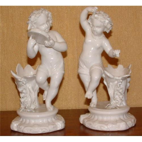 An Elegant Pair of Blanc de Chine English Porcelain Figures depicting a pair of dancing cherubs, one with clappers and the other with castonetts, both on circular bases. Circa last quarter of 19th Century. <p>