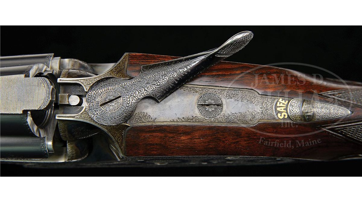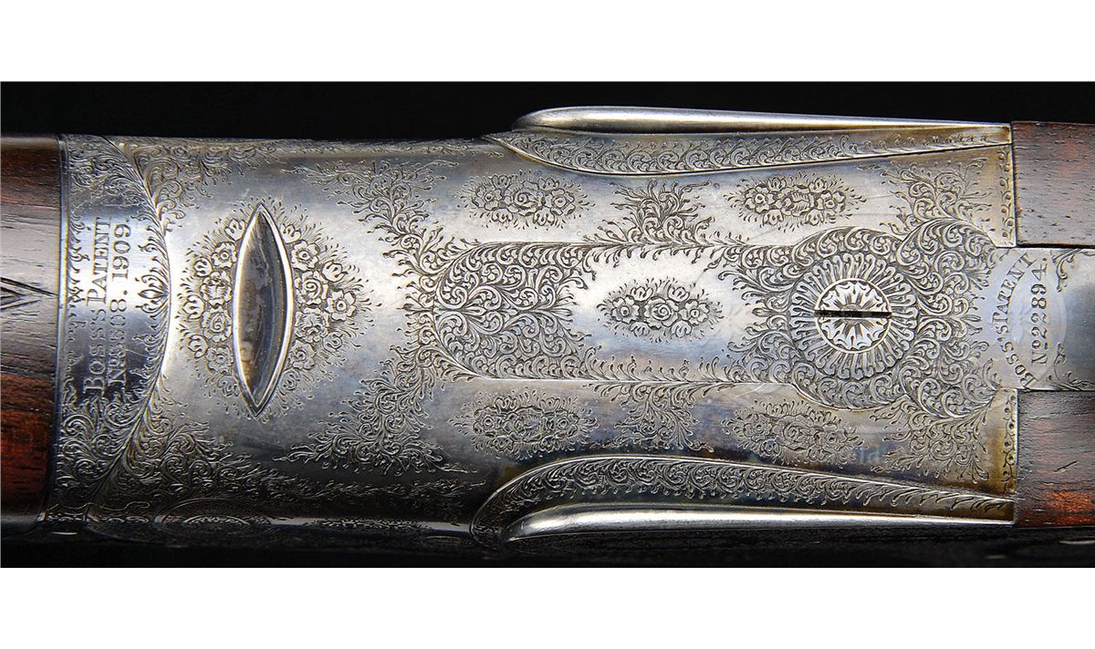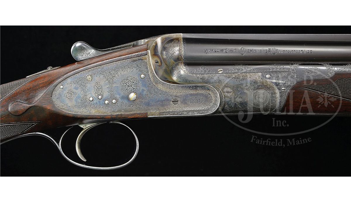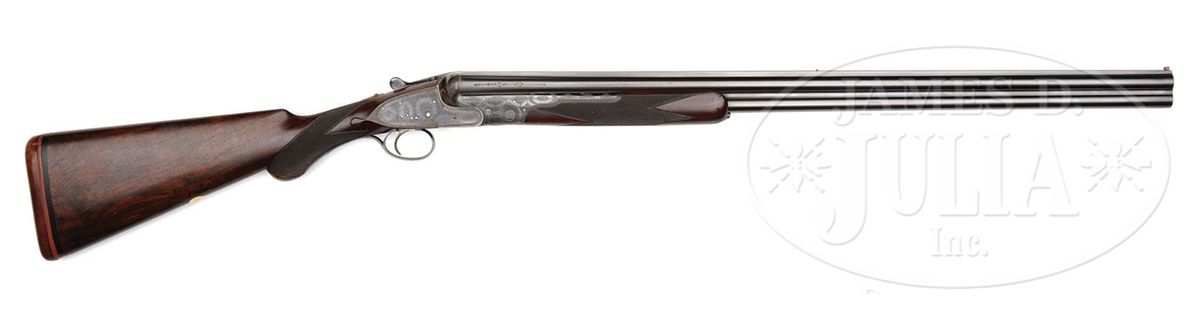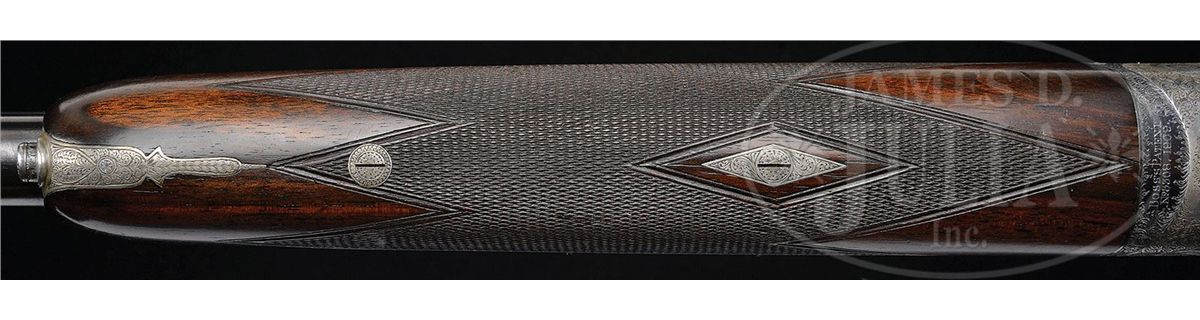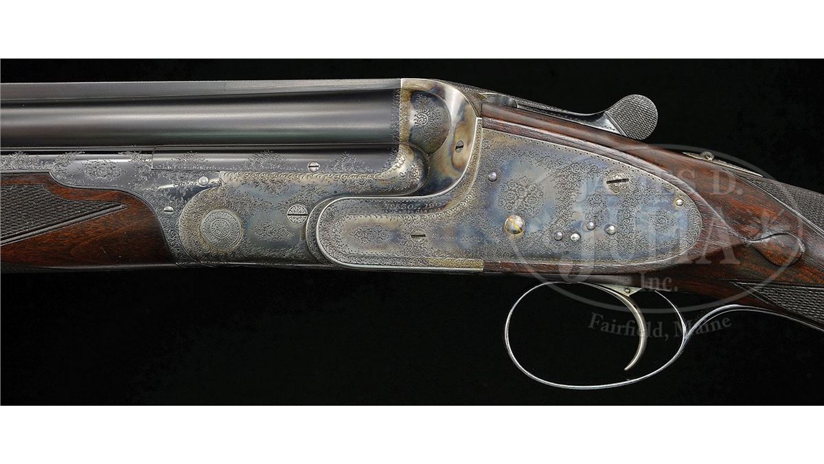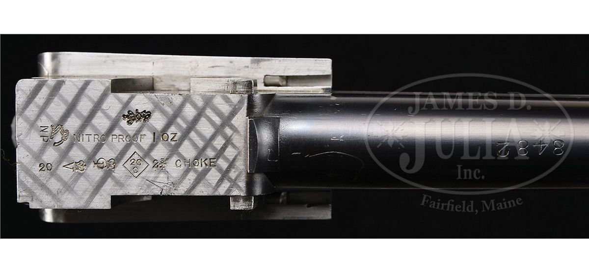 SN 8482. (ca 1937) Cal. 20 ga. 2-3/4" Chambers. 28" Demi-bloc bbls with broad, flat, matted rib, fitted with two red beads, are engraved "Boss & Co, 41, Albemarle Street, Piccadilly, London. W." and "Made in England" on either side of top bbl. Right side of top bbl and damascened bbl flat are stamped with London nitro proofs for 2-3/4" chambers and 1 oz. of shot. Case hardened, uniquely Boss, O/U action is beautifully sculpted at breech ends of bbls, with well filed beads at bottom. Action features hidden rising bite third fastener, bushed strikers, automatic safety (SAFE inlaid in gold), gold band tumbler end cocking indicators, Chilton locks with intercepting sears, and Boss's unique and excellent single trigger. Action is engraved with exceptionally well cut, small, shaded scroll with 14 rose bouquets, and additional roses front and rear of forend cut in bottom of action (by Sumner). "Boss & Co." is on each lockplate. "Patent No 3307.1909" referring to the over - under system, is on each side of the action. "Boss's Patent No 22894" is on trigger plate, referring to single trigger. Forend iron is engraved "Boss's Patent No. 3308.1909", referring to ejectors. Blued top lever and single beaded trigger guard, are also scroll engraved. SN is on trigger guard tang. Nicely streaked and well figured, dark, European walnut round knob, semi-pistol grip buttstock measures 14-1/2" over leather covered Silver pad, and features drop points, classic point pattern checkering with mullered borders, and a gold oval on toe line engraved "G. P." Matching, small, one piece, Boss ejector forend has Anson type release. Bore diameter: top -.615, bottom -.615. Bore restrictions: top -.007 (IC), bottom -.013 (Mod). Wall thickness: top-.027, bottom -.029. Drop at heel: 2-3/8", drop at comb: 1-7/16". Weight: 6 lbs. 6 oz. LOP: 14-1/2". PROVENANCE: Abercrombie & Fitch green hang tag with specifications of this gun. CONDITION: Excellent. Bbls retain essentially all of a London quality satin re-black, engraving and rib matting slightly softened. Action retains 85 - 90% orig case hardening color, silvered on sharp edges and beads, thinning slightly around bottom, from normal carrying wear. Lockplates retain nearly all of their vivid orig color. Orig blue of forend iron/ ejector housings is at about 90%, thinned and browned around bottom. Top lever is silvered at thumbpiece. Trigger guard is silvered on bead. Tang has been re-darkened. Stocks retain most of what appears to be their orig rubbed oil finish, maintained over the years with some extra oil rubbed into butt, with a number of very light marks and scratches. There is, what appears to be, a 5/8" crack running across lower right stock horn which does not move or flex. Checkering is very fine, with slight wear, and is dark. There is a 1/2" x 1/8" dent in checkering on bottom right side of forend. Bores are excellent, bright and shiny throughout, with slight evidence of dent removal on left side of top bbl. Action is tight. Bbls are on face. Ejectors are excellent, and in time. Lock screws show some use. An exceptionally fine, and lightly used, svelte little gun, with barrels that measure perfectly. Twenty-gauge Boss O/Us with single triggers and rising-bite style actions are exceptionally rare and among the most desirable British shotguns ever made. 4-49314 MGM241
