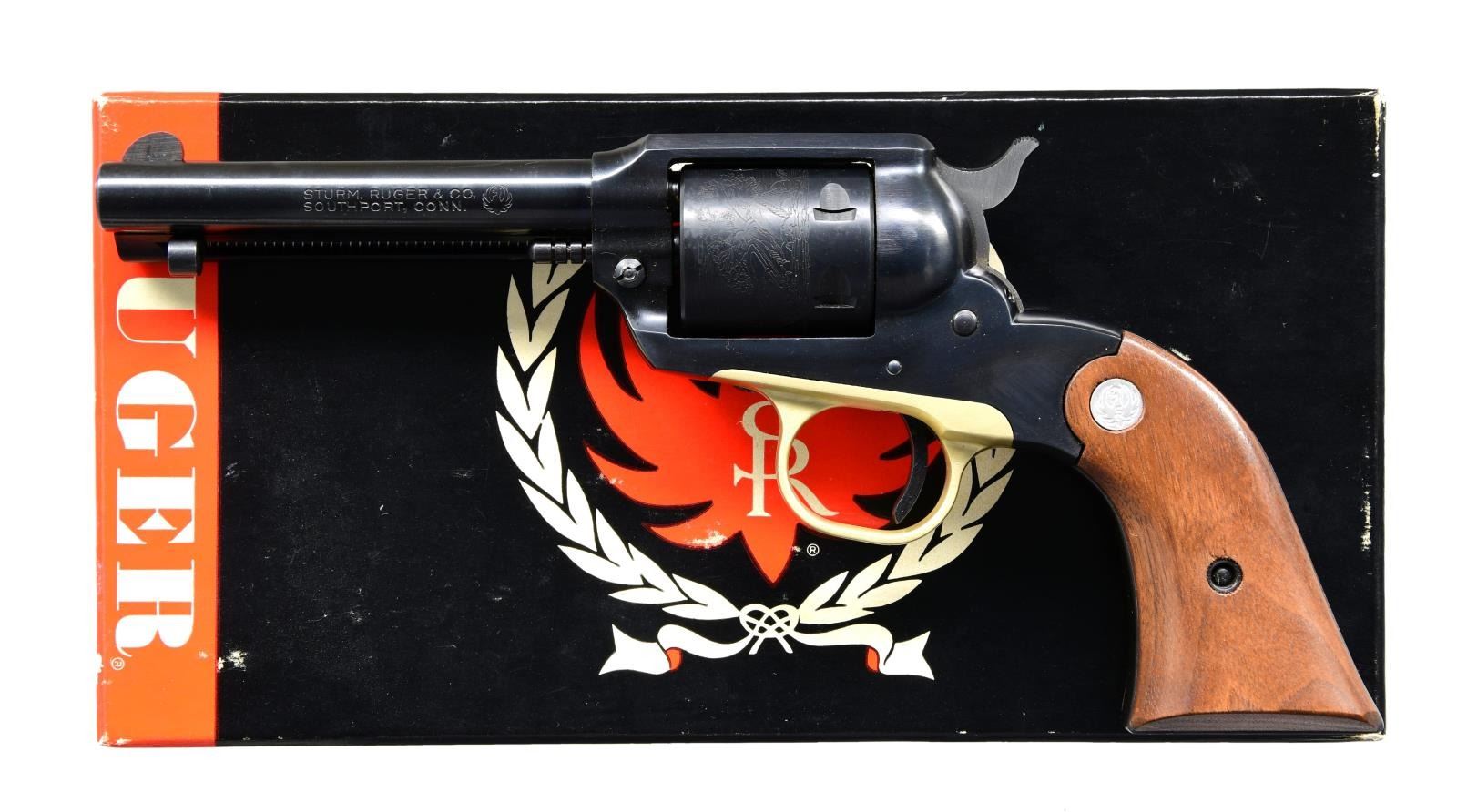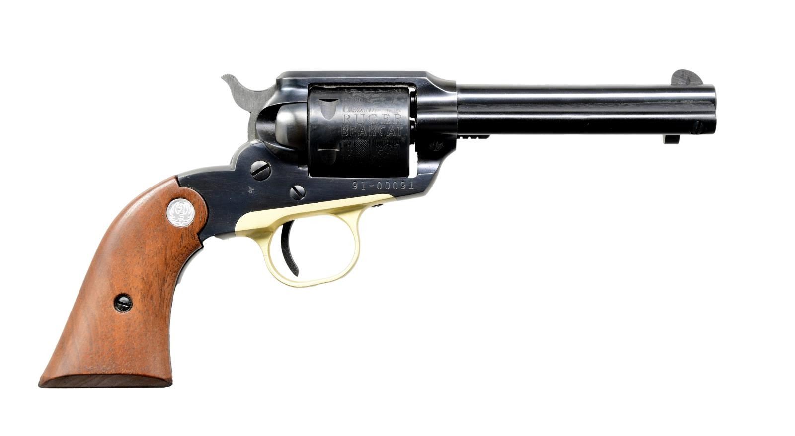Cal. 22 LR. S# 91-00091. Bbl. 4" (no "INC." in address and no caliber marking) with fluted blade sight, frame notched rear. Mfg. 1971 (1971-1974) as SBC4. Subscription firearms for Henry Rodeschin who was a long time employee. Henry and his brother William (also long time employee) operated Rody's Gun Shop about a 1/4 mile from the Newport factory and often acted as a FFL agent for the factory. Henry had subscription number 91 and unusual aspect of this Bearcat is that it has 91 as a prefix and ends in 91. Alloy frame and ejector housing plus brass toned anodized trigger guard. Smooth oiled walnut grips with all silver eagle medallions; has not been factory safety updated. UNATTACHED ACCESSORIES: Near excellent matching numbered box with all packaging to include brown waxed paper and "9/69" manual. CONDITION: all aspects near excellent with new, unfired appearance. (23-6087/NW). CURIO. $650-900.