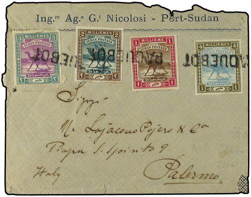 1907 Cover to Palermo franked by Camel Postman 1m., 2m., 3m. and 4m. values all tied by straight line ´Paquebot´ handstamps in black. Some edge wear to envelope, Palermo arrival on reverse. Sg 18-21.