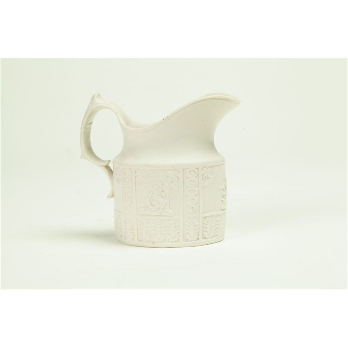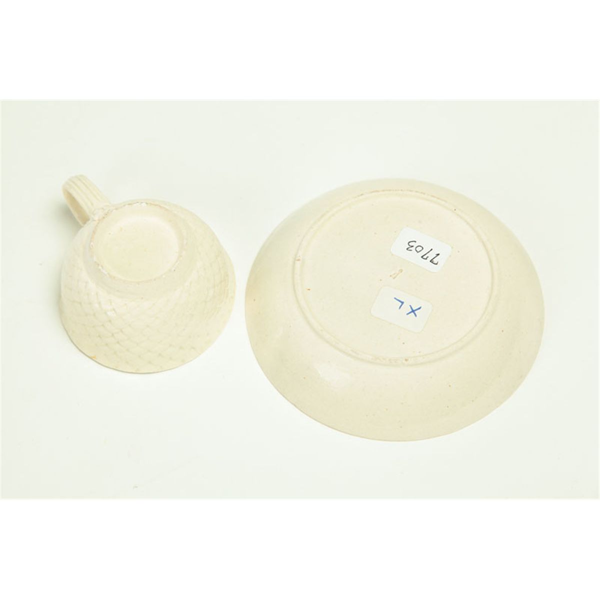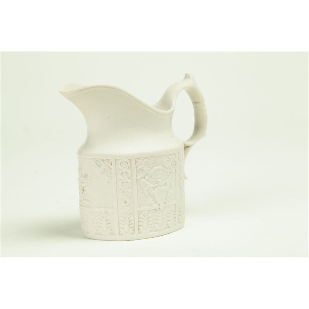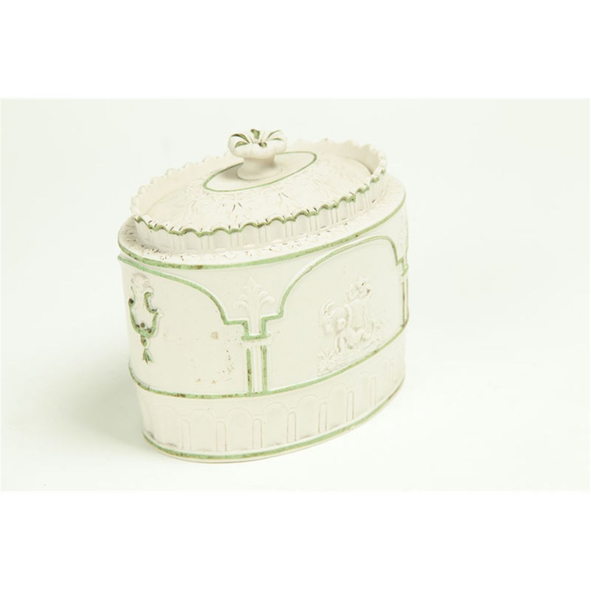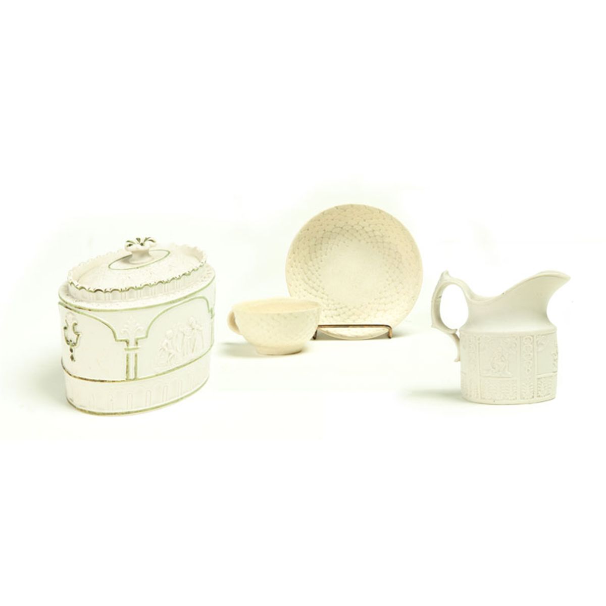 England, early 19th century, salt-glazed stoneware. Castleford types. Covered sugar with oblong bowl, molded figural decoration, and floral finial. Trimmed in green, 5 1/4"l. And creamer with molded decoration including eagle and shield. 4"h. Together with a child's cup and saucer in artichoke pattern.