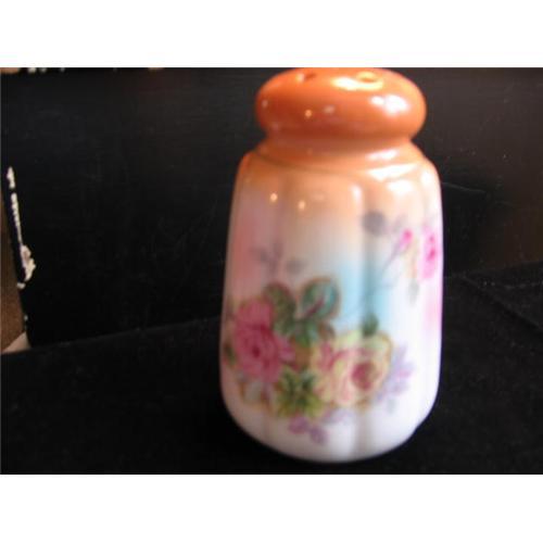 This gorgeous sugar shaker has a gold crown backstamp; I don't know which company this represents. The sugar shaker has roses on it; the background of these flowers is soft pink to blue, The top is pale rusty tan, which darkens as it rises. The holes are encircled with a gold line. It is corked. I see no chips ar cracks.