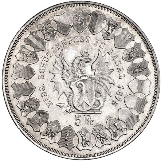 SUIZA. 5 francos. 1879. Basilea-Tiro. KM-5-14. DAV-388. EBC+.