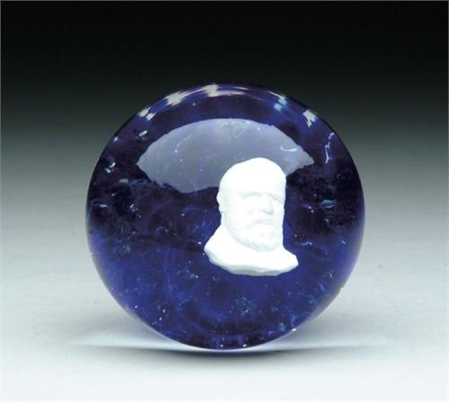 SULPHIDE PAPERWEIGHT. Sulphide portrait is of James Garfield on a cobalt blue ground. Unsigned, but attributed to St. Clair. SIZE: 2-3/4 in. dia. CONDITION: Very good to excellent. 5-71119
