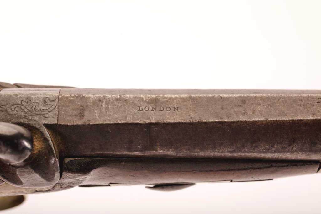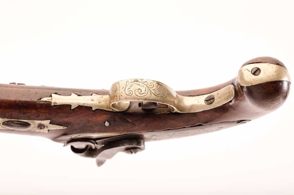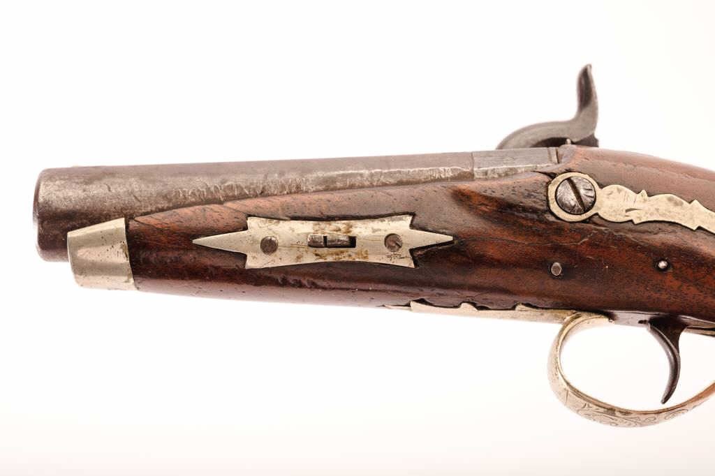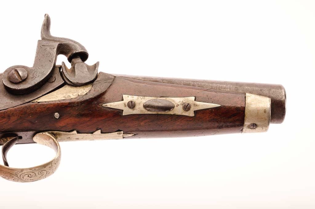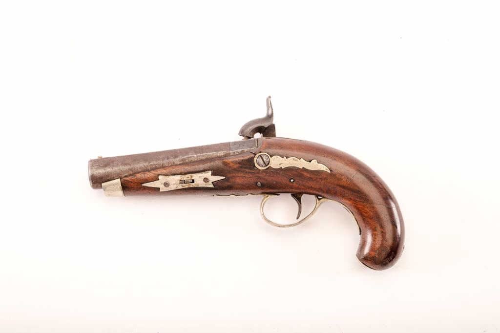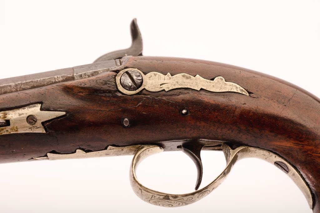 Interesting Philadelphia style percussion derringer marked “T. Perkins” on the lock and “London” on the barrel. Measures 8” overall with approximately .46 caliber 7 groove rifling and full stocked with German silvermountings. Made without ramrod and has a southern “Look”. T. Perkins may well have been an American agent or maker who imported locks or barrels. Dark brown patina. Working and fair to good overall. Note: Single key in barrel-Very St. Louis and Southern U.S.A. Also no British proof visible! (Antique) Est.: $500-$1000
