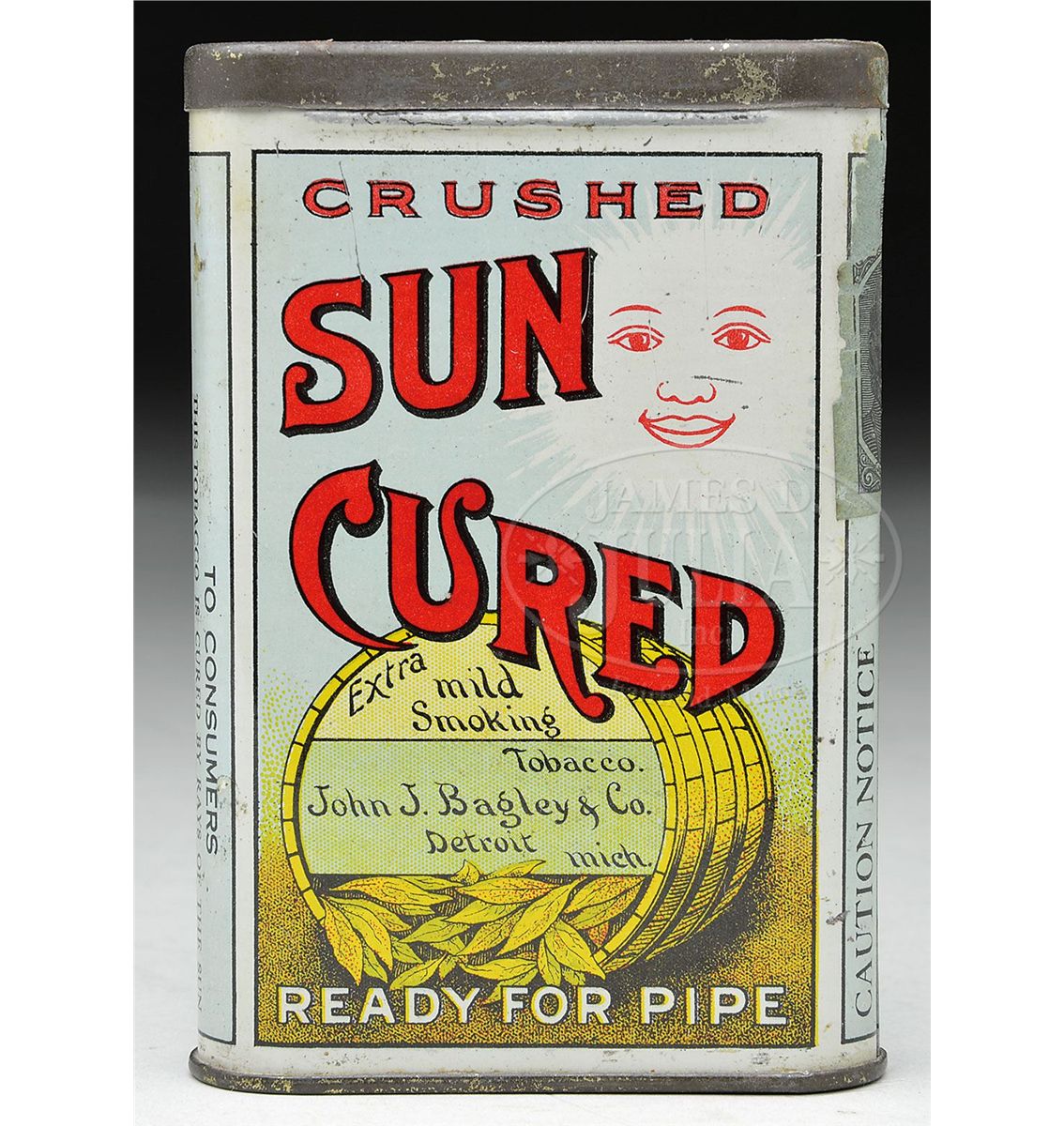 Tobacco barrel graphics beneath a smiling sun on front and reverse sides. Manufactured by the John J. Bagley & co., Detroit, Mich. SIZE: 4-1/2" t. CONDITION: Near excellent, some loss of plating to top. 1-13226-6